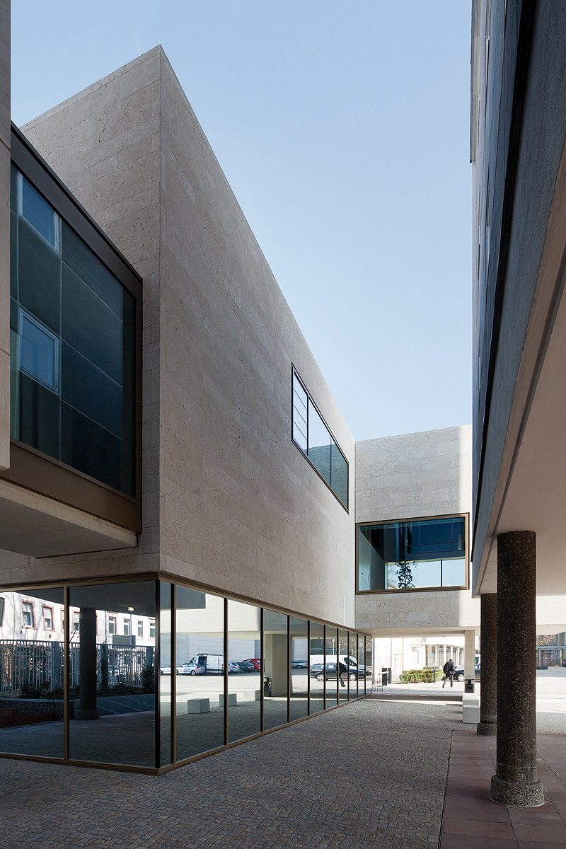 Die äußere Erscheinung des neuen Empfangsgebäudes präsentiert sich in Proportion, Materialität und plastischer Ausformung als besonderen Baustein innerhalb der Gerichtsgebäude und in der Karlsruher Innenstadt. Die äußeren Kanten beziehen sich einerseits auf Straßenfluchten der Amalien-/Herrenstraße (historischer Fächergrundriss der Stadt), andererseits werden die Orthogonalen zum Schellingbau aufgenommen.