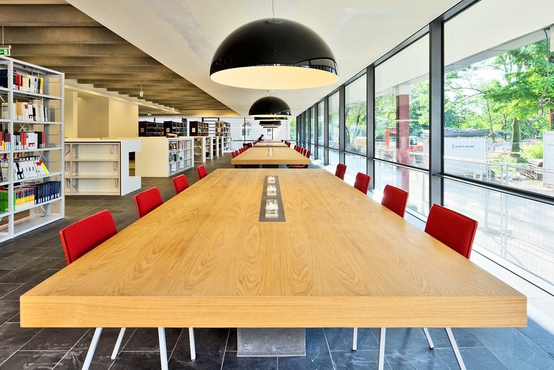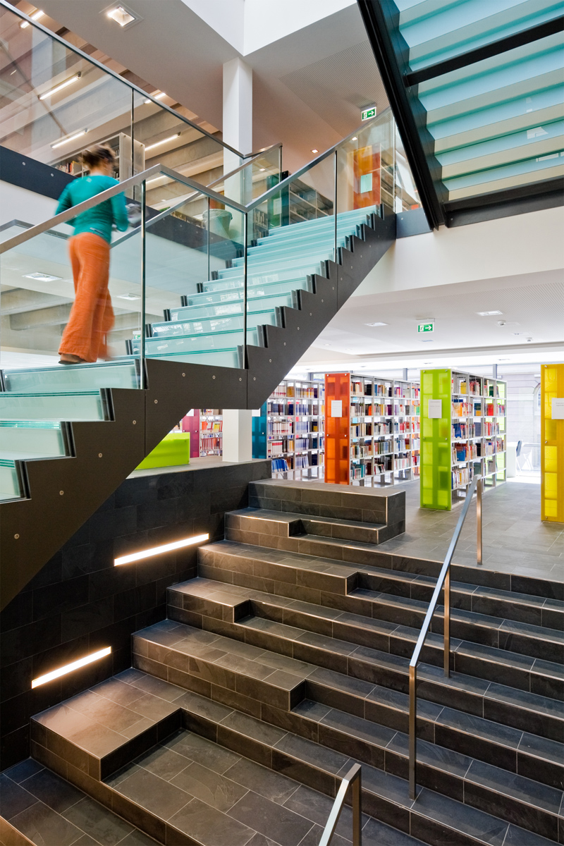Man betritt die Bibliothek über ein neu geschaffenes, glasüberdecktes Atrium. Es ermöglicht Einblicke in alle Etagen, gibt Orientierung und schafft mit dem freigestellten Aufzugsturm und den Treppen aus Glas und Stahl die vertikale Erschließung der einzelnen Ebenen. Die Freitreppe nach unten ermöglicht die notwendige Aufwertung der Bereiche im Untergeschoss. Das großzügig gestaltete Erdgeschoss wird bestimmt durch seine großen Lesetische, Sitzinseln und die freien Einzeltische entlang der Glasfassade.