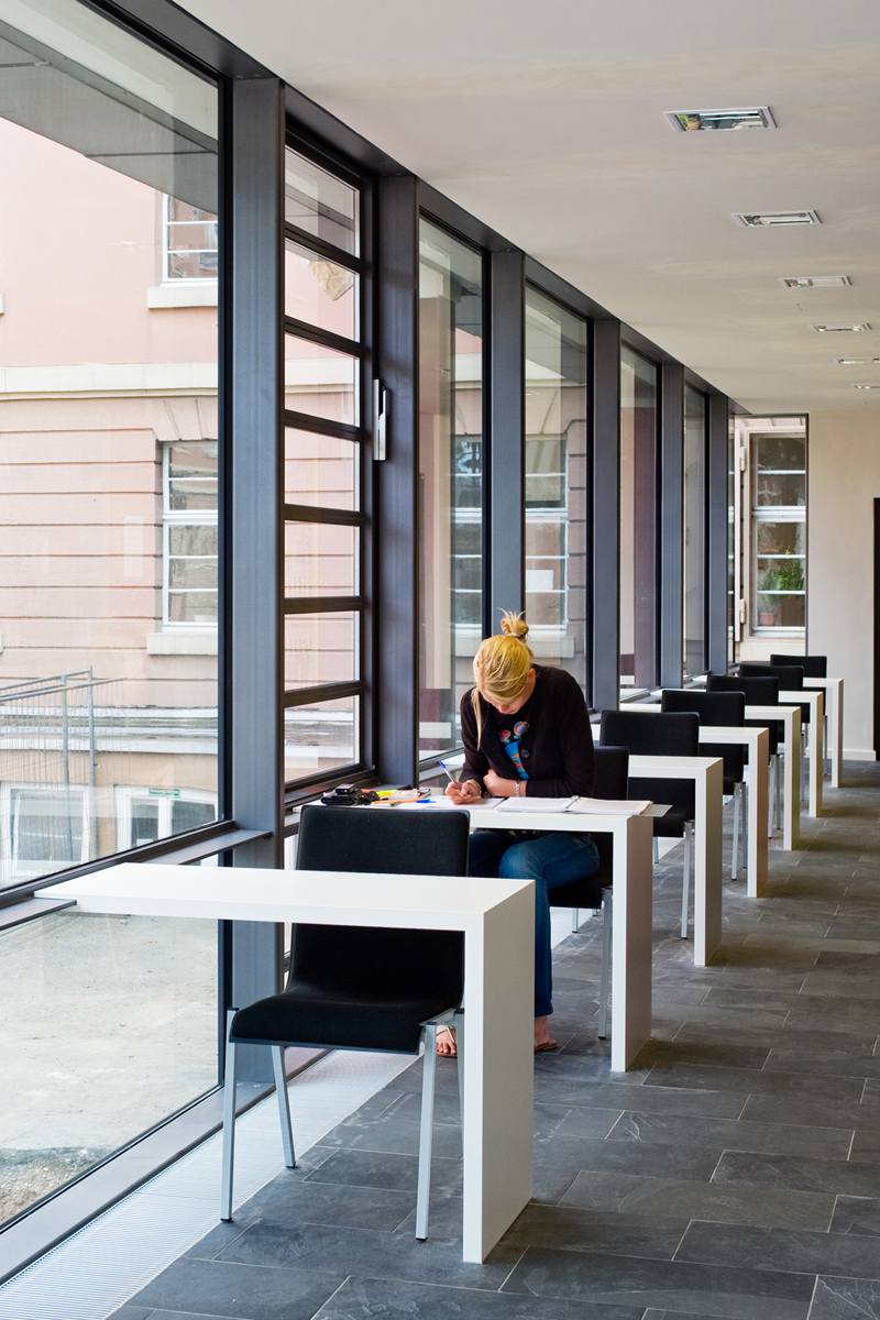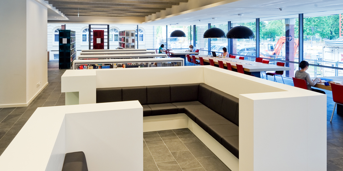 Den beiden unterschiedlichen Gebäudeteilen - der Vierflügelanlage von 1922 und dem komplett entkernten Anbau aus den 1950er- und 1970er Jahren - ordnet sich auch die Verteilung der neuen Nutzungen klar zu. Im historischen Altbau sind in den drei Obergeschossen die Institute mit Büros, Mitarbeiter- und Seminarräumen sowie die Cafeteria untergebracht. Die Bibliothek belegt den mittleren rückwärtigen Anbau und das Untergeschoss. Sie ist als eigenständige Institution separat erschlossen. Die Struktur des Altbaus macht es einfach, die Anforderungen an Büro- und Seminarräume zu erfüllen. Die repräsentativeren Räume werden in ihrer Materialität und Charakteristik herausgearbeitet und gestärkt. Eingriffe in die Substanz bleiben reduziert und werden gezielt - beispielsweise durch die neuen, tiefroten Linoleumbeläge in den Fluren - elegant unterstützt.