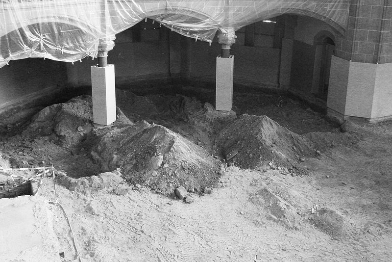 LösungDie originalen Bestandteile der Kirche bleiben in ihrer Gestalt im Grundsatz unverändert erhalten. Dort, wo Ergänzungen oder Änderungen erforderlich waren, sind sie so zurückhaltend wie möglich erfolgt. Die Kirche wird intensiv genutzt, bleibt aber auch als "Gesamtkunstwerk" erhalten. Der neu aufgebaute Boden mit neuer Bodenplatte hat einen geschliffenen Gussasphaltestrich als Oberfläche. Die neue Orgel nimmt wieder die Symmetrie des Kirchenraums auf. Das Orgelgehäuse ist aus lasierten Eichenholzstäben geschichtet. Vertiefte, blattgoldhinterlegte Stoßfugen reflektieren das Licht der Eingangsrosette und stellen die Klangentstehung im Gehäuse nach außen dar. Im Bereich der WC-Anlage im Kellergeschoss ist ein abgetreppter Fundamentkörper des Turms freigelegt und sichtbar. Die neuen Einbauten erfolgten abstrakt, weiß.