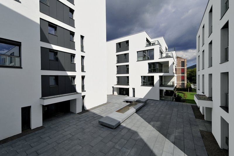 Städtebau Als Bestandteil des Geländes "Altklinikum Bergheim" stellt sich die neue Bebauung als prägnante Eigenform dar. Die umliegenden Großbauten und Ensemble-Strukturen tun dies ebenfalls, jedes auf seine Weise und in seiner Zeit. Diese bestehende Ansammlung von eigenwilligen Charakteren wird durch einen weiteren baulichen Typus bereichert, ein Carré aus vier Häusern, die um ein gemeinsames Podest arrangiert sind. Die Stellung der Häuser bezieht sich gleichwohl auf die benachbarte Krehl-Klinik, einzig der westliche Baukörper ist in die Bauflucht der benachbarten Vangerowstraße verdreht. Die vier Gebäude sind mit 4, 5, 6 und 7 Geschossen in ihrer Höhe gestaffelt, wobei der südliche Bau als niedrigstes Element der Krehl-Klinik auf Augenhöhe gegenübersteht. Die Bauten kreisen um eine neue Mitte, einen begrenzten Platz, einen engen gemeinsamen Raum, von dem aus die privaten Wohnungen erschlossen werden. Diese wiederum nutzen den weiten Blick ins umliegende Grün, den 360° Rundbezug zu Stadt, Land, Fluss.