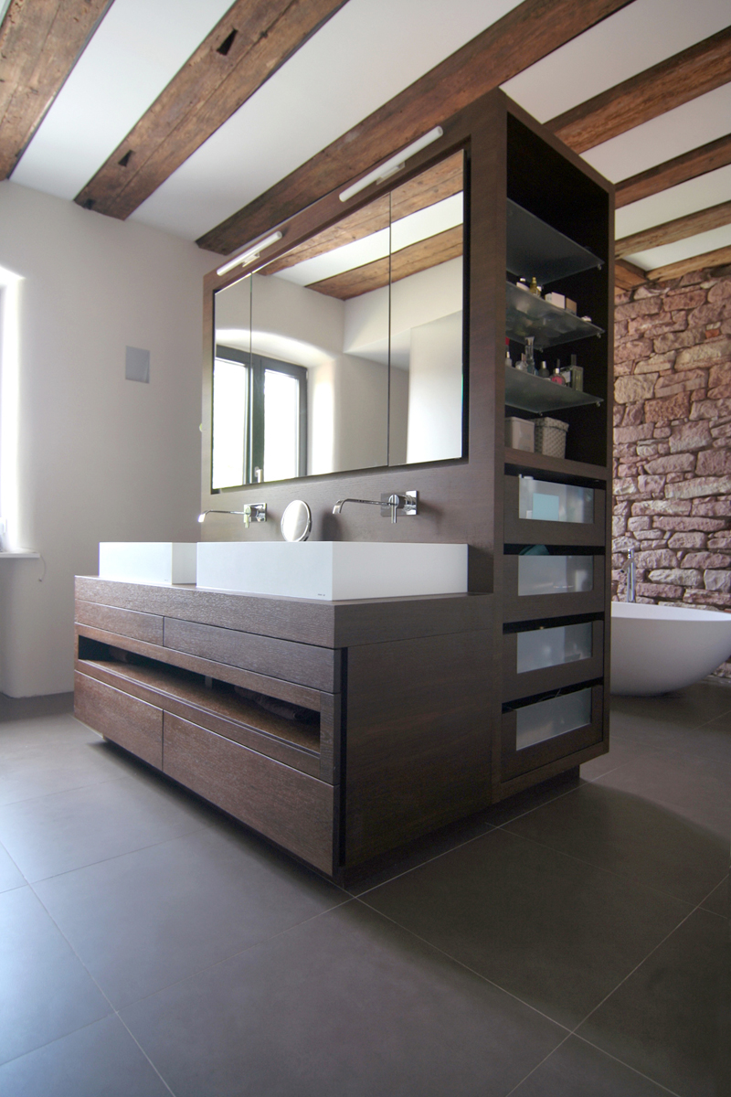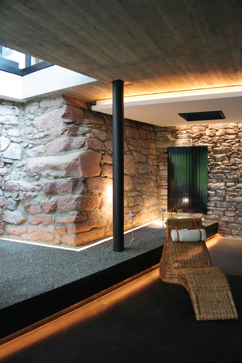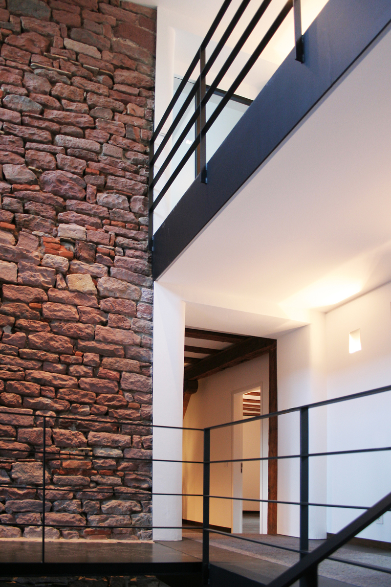 Wo die Altsubstanz es zuließ, wurde diese freigelegt und wieder aufgearbeitet und sichtbar beibehalten. Übergänge und Brüche wurden bewusst herausgehoben und dargestellt. Die Altsubstanz wurde nicht geschönt, sondern lediglich in ihrem Bestand gesichert. Neue Bauteile wie Treppen, Geländer, Beläge wurden im bewussten Kontrast zur historischen Bausubstanz gewählt. Die Details beschränken sich auf ein Minimum, sodass im Wesentlichen nur Materialitäten erkennbar sind. So entsteht ein spannungsreiches und interessantes Neben- und Miteinander von Alt und Neu.