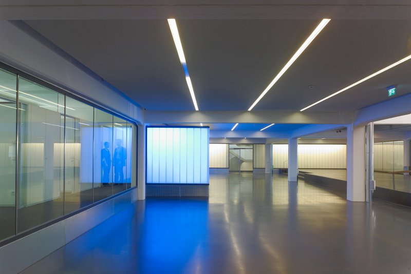 Im Obergeschoss werden die freistrahlenden, „historischen“ Lichtlinien von Lehmbruck an der Tonnendecke aufgenommen und durch eine regelbare, zeitgemäße Beleuchtungstechnik ersetzt. Ergänzend kommen punktuell individuelle Beleuchtungslösungen (Leseleuchten, Regalbeleuchtung) zum Einsatz, um eine differenzierte Lichtatmosphäre zu schaffen. Im Erdgeschossfoyer wird unter der gesamten Decke zwischen den Unterzügen eine Akustikdecke zur Schallabsorption eingebaut. In diese Decke sind ebenfalls durchgehende, regelbare Lichtlinien eingelassen, die in Rampenrichtung verlaufen. Im Vortragsraum werden die Lichtlinien noch durch punktuelle Strahler ergänzt, um differenzierte Beleuchtungssituationen zu ermöglichen. Sämtliche „Einbauten“ (Zentrales WC, Zuluftbauwerke im Foyer, Büroboxen) sind aus mattiertem Profilbauglas (Linit) konstruiert und können ebenfalls indirekt von innen beleuchtet werden.