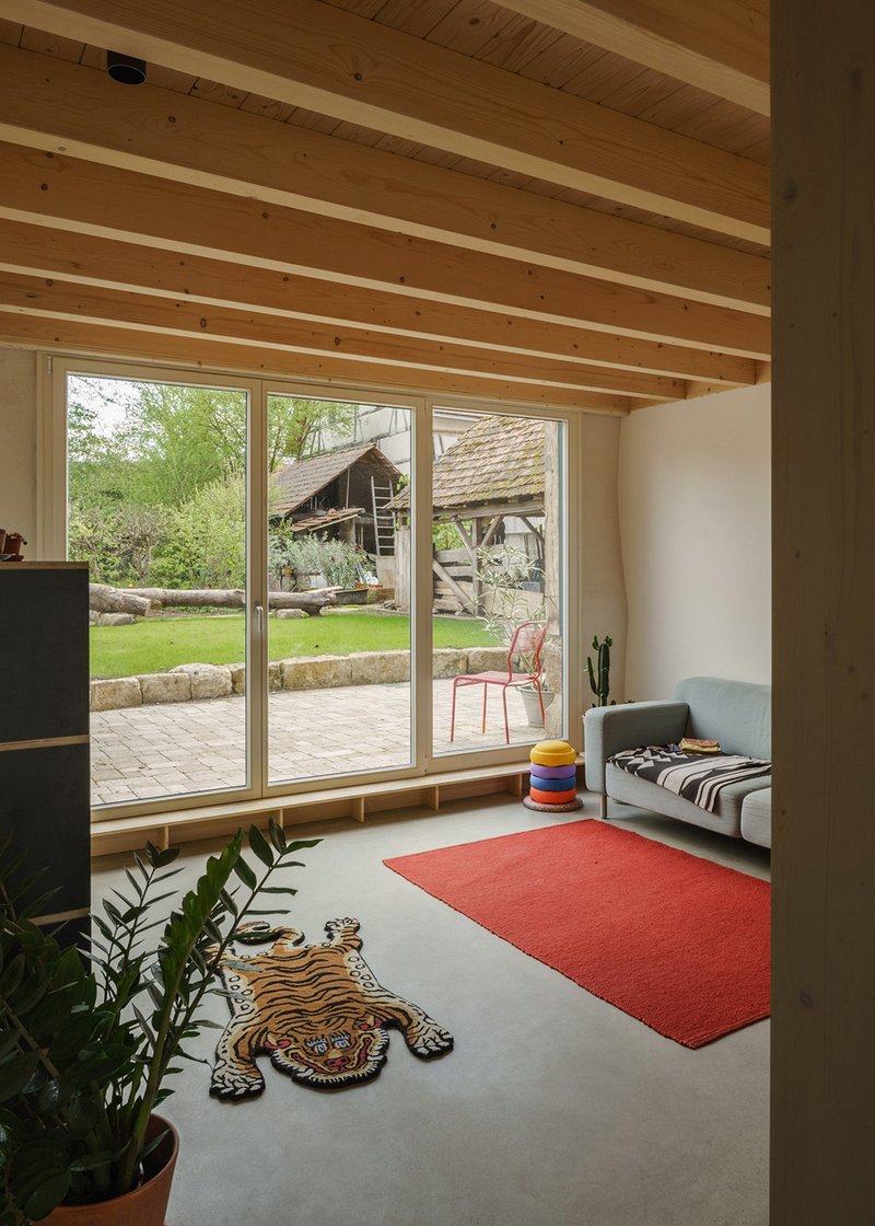 Die äußere Hülle blieb weitgehend erhalten. Großflächige Verglasungen wurden durch vertikale Holzlamellen zurückhaltend in die historischen Scheunentore integriert. Neue Öffnungen wurden auf ein Minimum beschränkt, um die charakteristische Anmutung des Ökonomiegebäudes zu wahren. Im Inneren entstanden durch minimale Eingriffe und eine geschickte Nutzung der bestehenden Raumstruktur großzügige Wohnqualitäten. Eingestellte Emporen, multifunktionale Einbauten und zentrale Holztreppen erschließen die Räume und zonieren diese zugleich.