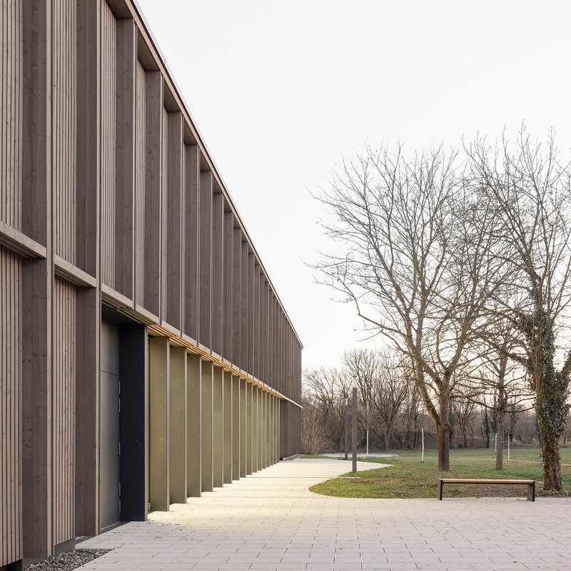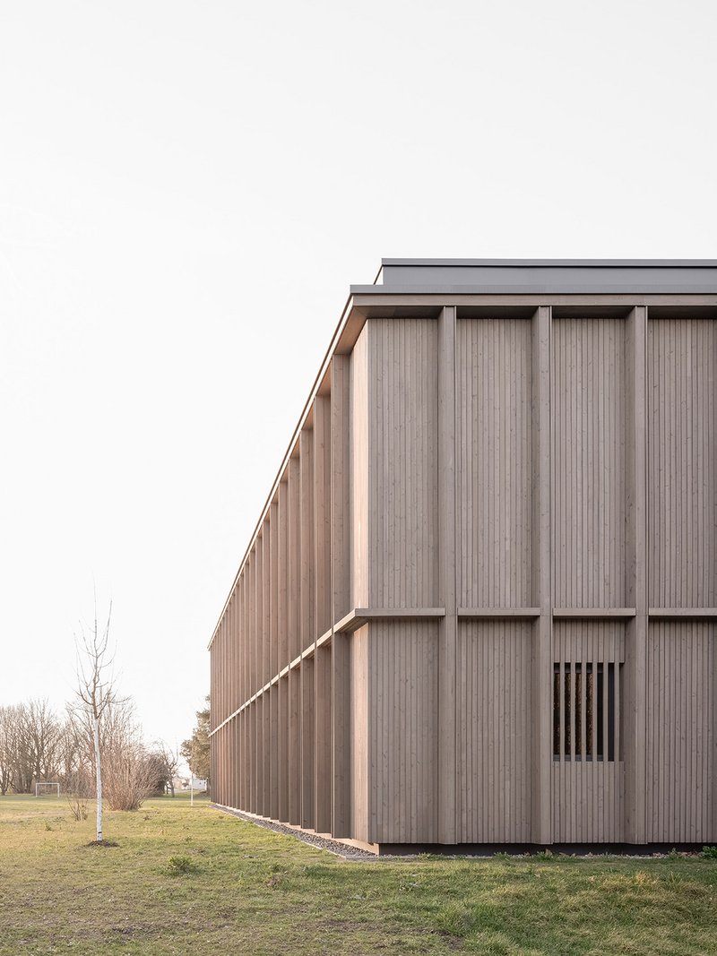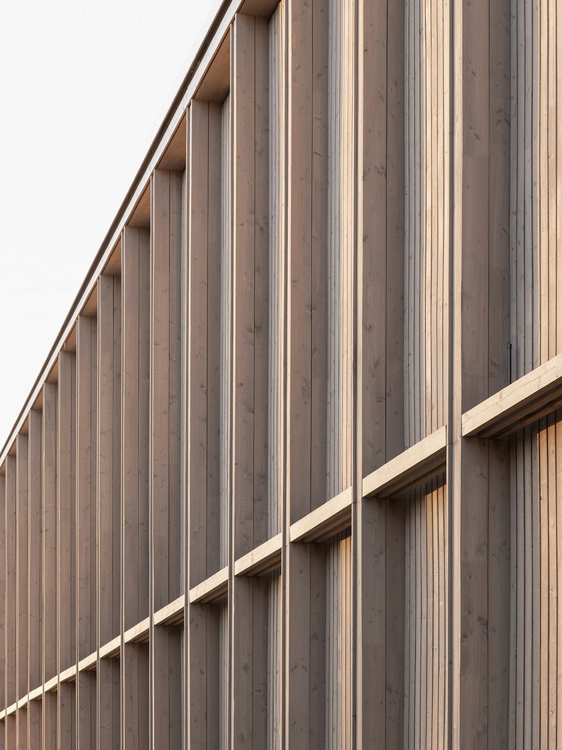 Konstruktion. Technik. Details. Ausführung.Das Gebäude ist als Holz-Hybrid-Bau mit hohem Vorfertigungsgrad ausgeführt, welche eine wirtschaftliche, schnelle Bauweise ermöglichte. Das Tragwerk kombiniert Stahlbeton mit Holzwerkstoffen in einem effizienten Raster. Ein konstruktiver Holzschutz sorgt für Langlebigkeit der Fassade. Innenraumoberflächen sind auf Akustik, Wartungsfreiheit und Nachhaltigkeit ausgelegt. Der Low-Tech-Ansatz setzt auf natürliche Lüftung, energieeffiziente Beleuchtung und kurze Installationswege zur Reduktion von Betriebs- und Wartungskosten.