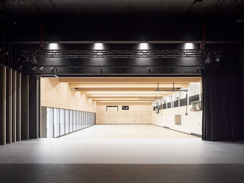 Konzeption. Funktion. Angemessenheit.Ziel war eine hohe Multifunktionalität bei gleichzeitig kompakter und nachhaltiger Bauweise. Während das Foyer als Ganztagesessbereich dient, kann die Bühne als zusätzlicher Gymnastikraum genutzt werden. Die zweigeschossige, klar gegliederte Struktur ermöglicht eine effiziente Raumnutzung. Tageslicht, optimierte Fassadenöffnungen und natürliche Materialien sorgen für eine angenehme Innenraumqualität. Die Holzbauweise mit gezieltem Materialeinsatz kombiniert Ästhetik, Nachhaltigkeit und Funktionalität.