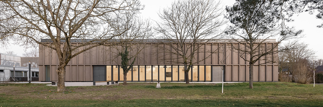 Umgang. Grundstück und Freiraumgestaltung.Der Ersatzneubau liegt direkt neben der ehemaligen, abgerissenen Sporthalle. Zusammen mit der benachbarten Kita und Grundschule bildet der Neubau ein zusammenhängendes Gebäudeensemble. Die neu gestalteten Außenanlagen sind mit den Wegen des öffentlichen Raums verbunden, schaffen definierte Aufenthaltsbereiche und bilden eine klare, einladende Eingangssituation. Die Freiräume tragen dabei zu einer bewussten Orientierung auf dem Campus bei.