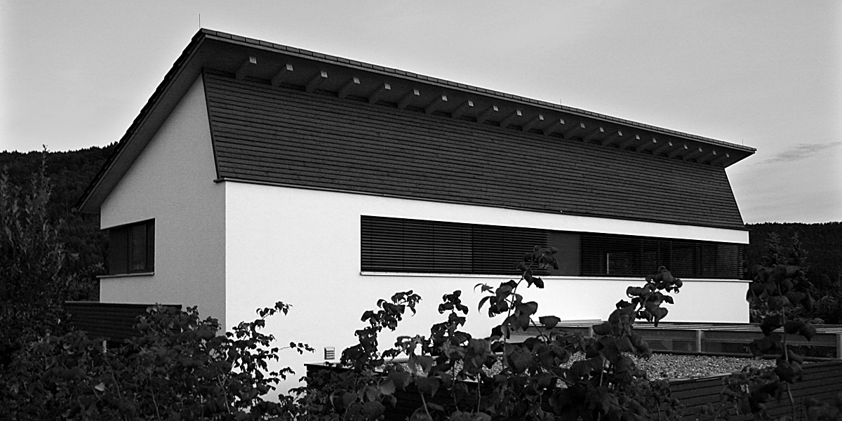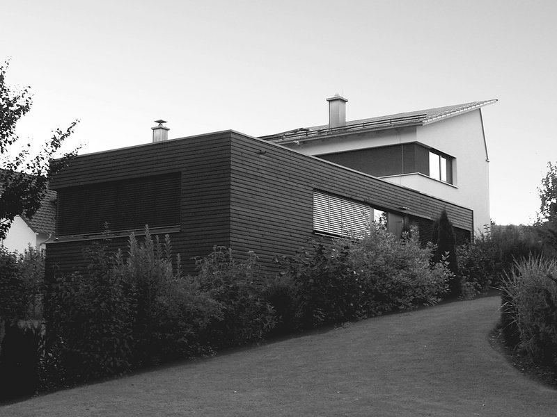 In Hanglage am Ortsrand von Hausen am Tann befindet sich das Wohnhaus. Aufgrund der topografischen Situation bot sich eine Gliederung in zwei Baukörper an. In exponierter Lage, mit weitläufigem Blick über die Schwäbische Alb, ist das Haupthaus von der Straße abgerückt. Orthogonal dazu steht der zweigeschossige Anbau. Im Gelenk befindet sich der Zugang, der über eine außenliegende Treppe im Erdgeschoss zu erreichen ist.
