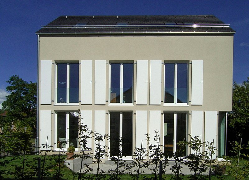 Architektonisch entlehnt der Neubau Stilelemente aus dem Kontext und interpretiert diese neu. Neben der Geschossigkeit und dem unbesetzten Satteldach sind der fein gezahnte Dachüberstand und die Fensterläden die prägenden Charakteristika. Die Klappläden dienen funktional als Sonnen und Blickschutz und ermöglichen mit ihrer farblich differenten Corean-Beschichtung wechselweise eine extrovertierte Eleganz oder einen monochromen Kubismus. Durch die Fuge zwischen Fensterladen und Fensterleibung dringt ausreichend Helligkeit für eine natürliche Belichtung der Räume trotz effektivem Sonnenschutz. Die hinterleuchteten Fugen zeichnen die Konturen der Gebäudeöffnungen nach und lassen den architektonischen Charakter auch bei Dunkelheit erahnen.