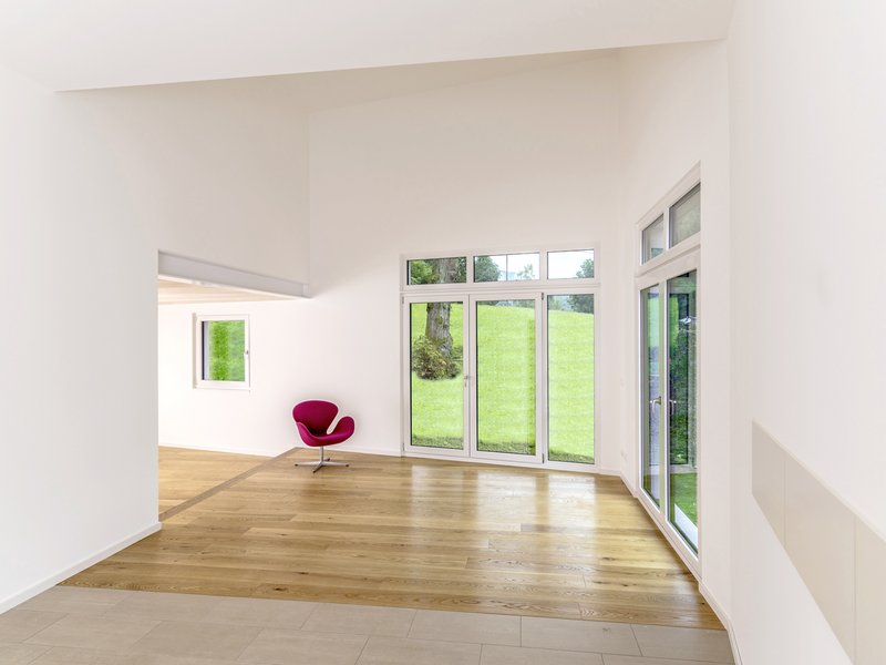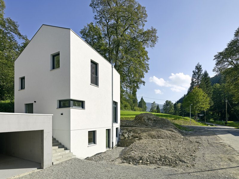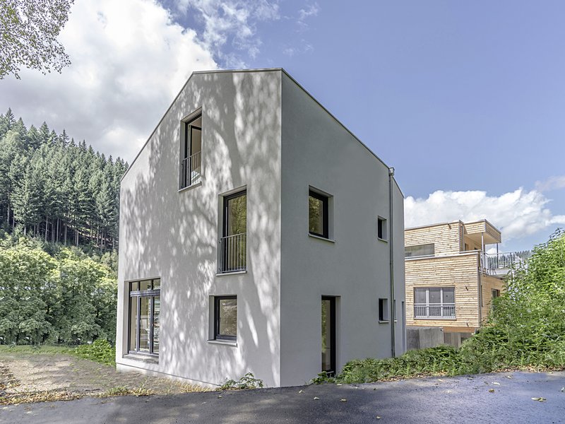 Ein Grundstück am Waldrand, eine traumhafte ruhige Lage im Schwarzwald, am Fuße des Schauinslands. Es entstand die Idee, das Gebäude ganz selbstverständlich in die Landschaft einzufügen. Außen zurückhaltend, ruhig und bescheiden, fast verschlossen. Ein steinerner Findling? Ein geschliffener Stein, scharfkantig, mit unregelmäßigen Poren (Öffnungen) zu finden am Waldessaum. Ein Gebäude, das sich langsam entfaltet. Das Budget der Bauherrschaft war begrenzt und strengstens gedeckelt und definierte dadurch im Zusammenhang mit dem gewünschten Ausbaustandard das kompakte Volumen des Gebäudes, welches das baurechtlich vorgegebene Baufenster in der Grundfläche lange nicht ausschöpft. Die angeschnittenen Gebäudeecken sind eine kleine Maßnahme - jedoch mit großer Wirkung: Äußerlich wird der Eindruck des kubischen, blockhaften eines Felsens oder geschliffenen Steines durch steigende und fallende Trauflinien unterstützt – und im Inneren entstehen spannungsvolle Räume. Aber die Bauherrschaft suchte immer weiter, wünschte sich noch mehr als "nur" Räume. Deren Anzahl war vorgegeben und in einem lange währenden Prozess wurde nach einem Raumplan, einem Raum-Erlebnis gesucht. Das wird gefunden durch eine gedankliche Spaltung des Gebäudes unterhalb des Firstes: Angelehnt an den schützenden und lichtschluckenden Waldrand entstand im Osten die niedrigst mögliche Stapelung der (notwendigen) Räume inklusive eines heimeligen Kaminzimmers. Hierbei wird die baurechtlich zulässige Gebäudehöhe und Geschossigkeit maximal ausgeschöpft, aber nicht überschritten. Demgegenüber öffnet sich im Südwesten der Essbereich mit großzügiger, fast verschwenderischer Raumhöhe bis zum Dachraum und führt den Blick hinauf zum Schauinsland, holt Licht und Landschaft tief ins Gebäude und führt seinerseits hinaus – über die Terrasse hinauf in den Schwarzwald. Innen zeigt sich das Gebäude großzügig, hell und abwechslungsreich. Begangen werden die Ebenen über einläufige Treppen. Doch in der Schlafebene führen plötzlich zwei Treppen weiter nach oben: Um der Wohnküche Raumhöhe zu schenken, wurde der darüber liegende Schlafraum höher als das behütende Kaminzimmer gehoben. Das nach außen kompakt und schlicht auftretende Gebäude entpuppt sich als ein Konstrukt von Räumen unterschiedlichster Geometrie, Dimension und Proportion und bietet so trotz seiner Bescheidenheit ein überraschendes Gebäude.