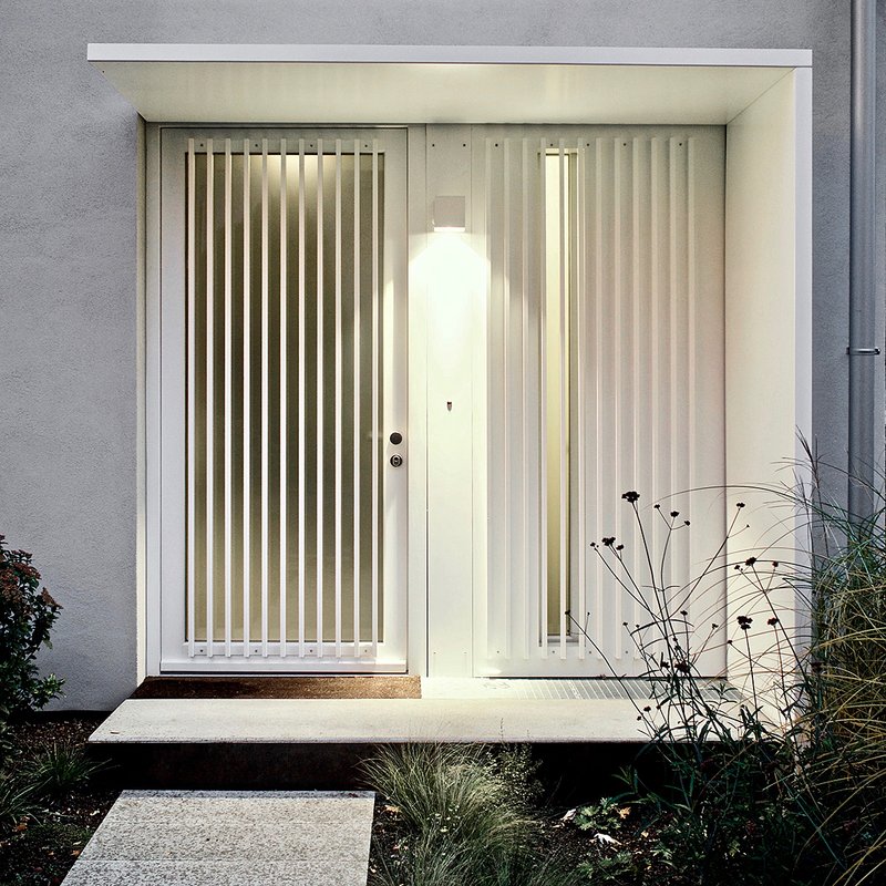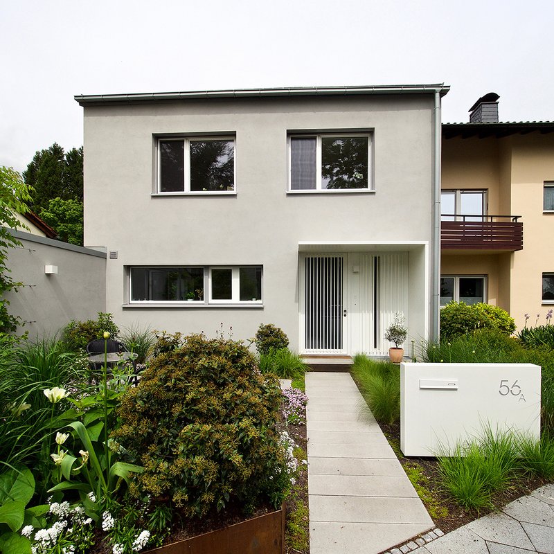 Das in die Jahre gekommene Wohnhaus aus den 1960ern sollte für eine vierköpfige Familie umgebaut und energetisch saniert werden. Der Charme und die Großzügigkeit des vorhandenen Gebäudes sollten wiederbelebt werden.Durch einen respektvollen Umgang mit der Substanz erfolgten nur wenig Abbruchmaßnahmen. So wurde der nur aufwendig zu sanierende Balkon im OG zu Gunsten der wärmedämmenden Hülle abgetrennt; einige Fensteröffnungen wurden vergrößert. Die kleine Einbauküche wurde dem großen Raum zugeschlagen und ermöglicht nun neue Sichtverbindungen über die Wohnebenen.Der Raumfluss der Split-Level-Ebenen wurde verstärkt, Sichtmauerwerk aus der Bauzeit aufgearbeitet und vorhandene Stahlkonstruktionen wurden mit neuen Füllungen und Belägen ausgestattet. Ein reduziertes Farbkonzept lässt die weißen Stahlkonstruktionen wie Brüstungen und den überdachten Eingangsbereich erstrahlen.Passend zum Innenraum wurde ein Außenraumkonzept entwickelt und umgesetzt. Der Vorgarten im Süden, zur Wohnstraße orientiert, erhielt einen sonnigen Sitzplatz für nachbarschaftliche Kontakte. Der rückseitige Garten im Norden setzt mit geometrisch im Rasen liegenden Beeten, Holzdeck, Plattenbelägen die Architektur im Außenbereich fort.