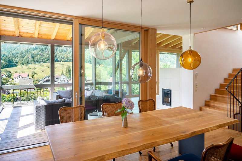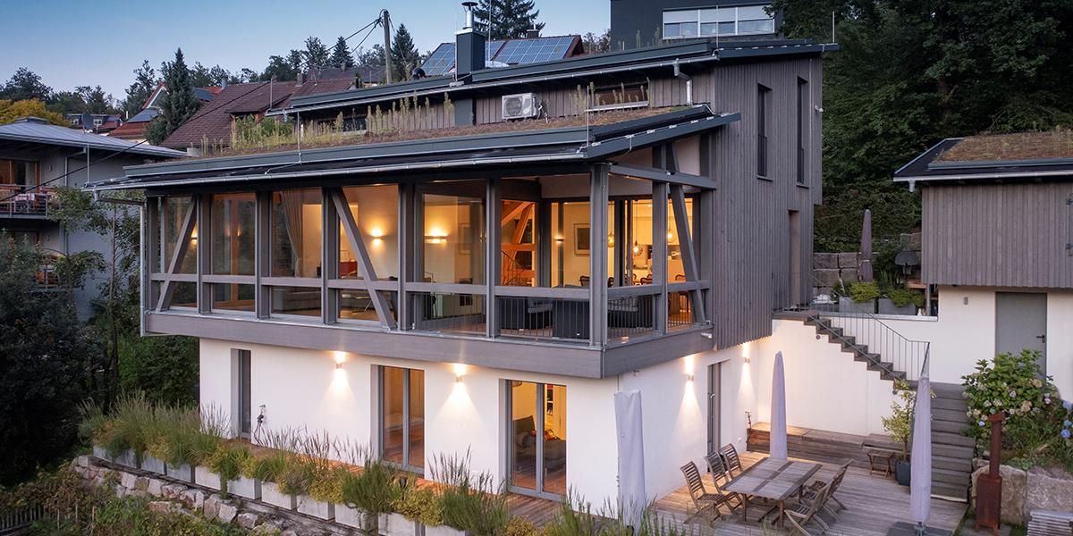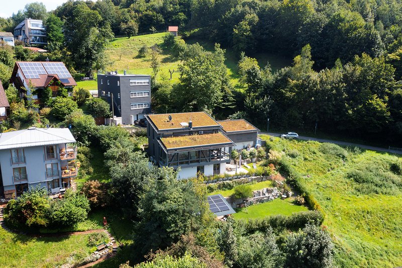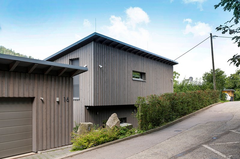 Die Holzkonstruktion sitzt auf dem massiven Sockel des Gartengeschosses. Die Lage am Hang bringt eine Öffnung der Fassade zum Tal mit sich, sodass ein wunderbarer Ausblick auf die Hänge des Schwarzwaldes ermöglicht wird. Zwei begrünte Hauptdächer und Garagendach treppen sich als Pultdächer mit gleicher Neigung zum Tal hin ab, sodass sich das Bauvolumen an die Hangneigung anpasst. Nischen in den Stützwänden des terrassierten Hanges aus Schwarzwaldgranit-Blöcken laden zum Sitzen ein.