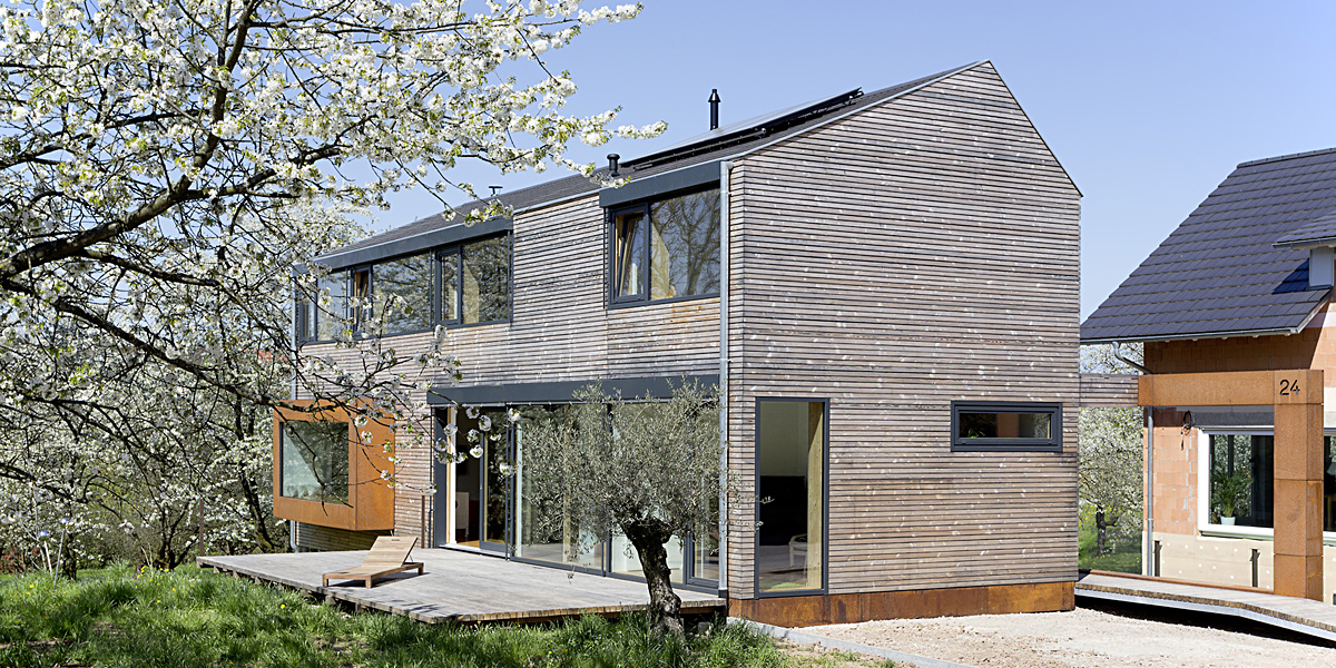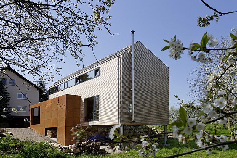 Die Fassade des Hauptbaukörpers besteht aus einer unbehandelten und offenen Douglasie-Verkleidung, welche sich als kontinuierliche Haut um das Gebäude zieht. Die Holzfassade wird durch die Cortenstahl-Verkleidung kontrastiert. Der wetterfeste Baustahl bildet den Übergang zwischen dem Hanggrundstück und dem eigentlichen Holzbaukörper. Die Cortenstahl-Fassade ist eine besondere Art der Eigenleistung. Das Fassadensystem wurden von der Metallbaufirma des Bauherren in Zusammenarbeit mit den Architekten entwickelt und in Eigenleistung produziert, bzw. vorgefertigt.