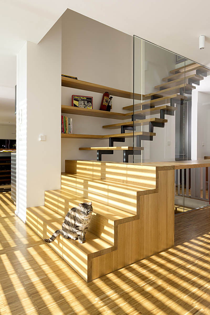 Am Dorfrand, in einer der Kirschbaumwiesen, schwebt das Gebäude über dem leicht abfallenden Gelände. Wie ein Schiff dockt der schlanke Baukörper an die Landschaft an und wird gleichzeitig von der Straße aus über einen Holzsteg erschlossen. Die Natur kann ungestört unter dem Haus hindurch fließen und weitere Grünflächen auf terrassierten Ebenen bieten der jungen Bauherrenfamilie spannende Außenräume mit unterschiedlichen Ausrichtungen und Qualitäten.