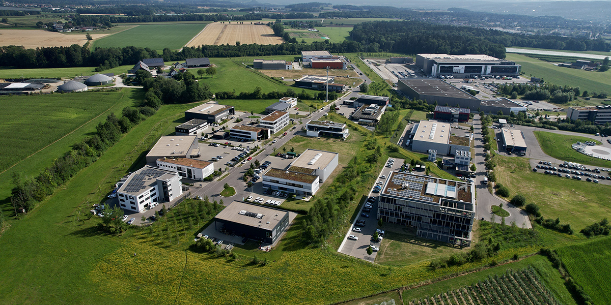 Die Setzung der Haine und der verbindenden Wiesenstreifen folgt der hängigen Topografie und deren Veränderung in für das Gewerbe erforderliche Terrassen und den daraus resultierenden Steilhängen, welche zur naturnahen Begrünung genutzt wurden. Die zentrale Feldhecke mit Graben und vorhandene Einzelbäume wurden respektiert und integriert. Dass dies während der jahrelangen Bauphase gelang, ist das Ergebnis einer intensiven Bauleitung.
