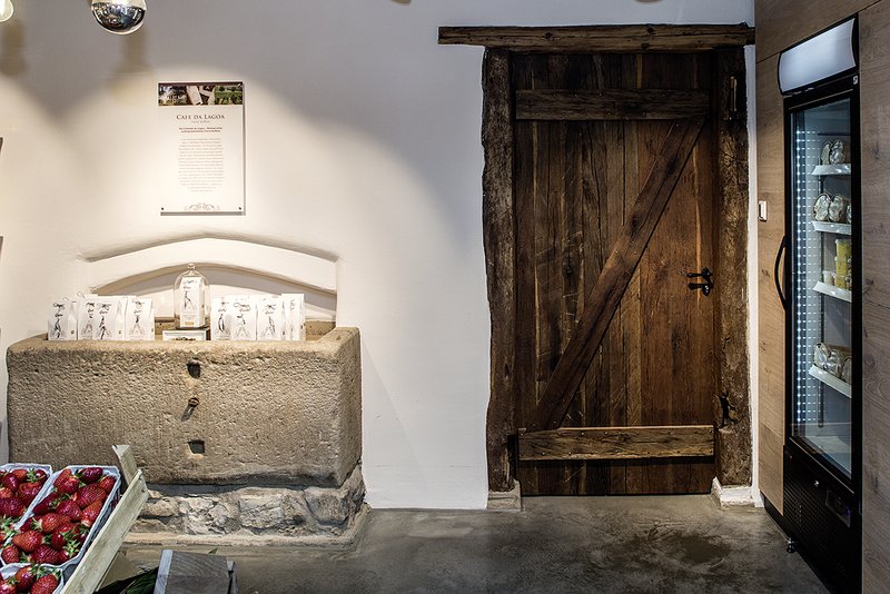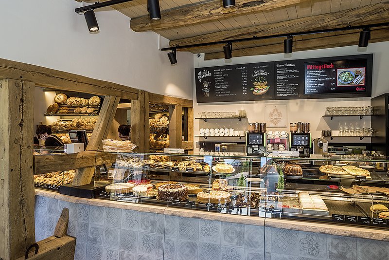 Die historische Mühlenscheuer wurde in ihrer Grundstruktur mit allen besonderen Details in die Planung mit einbezogen. So wurden die bestehenden Tore, Türen und Stallfenster für die Neuplanung genutzt. Das Fachwerk, die Holzbalkendecken, die historische Kappendecke, Bruchsteinwände und Futtertröge aus Sandstein wurden restauriert und integriert.Ein ergänzender Neubau, bewusst abgesetzt, mit Flachdach, einer modernen Holzständerkonstruktion, Rombusverschalung und großflächigen Stahl-Glas-Pfostenriegelflächen erweitert die Fläche der historischen Mühlenscheuer und nimmt die Nebenräume wie Anlieferung, Personalbereich und WC-Anlage auf. Im Altbau ist der großzügige Verkauf, der Landmarkt und der Raum für die Backkurse angeordnet. Das Café orientiert sich durch die große Glasfassade nach außen gut sichtbar zur Durchgangsstraße. Die überdachte Außensitzfläche ist zum neu geschaffenen Dorfplatz, eine zweite Außenfläche mit großem Holzsteg zur Lauter hin orientiert.