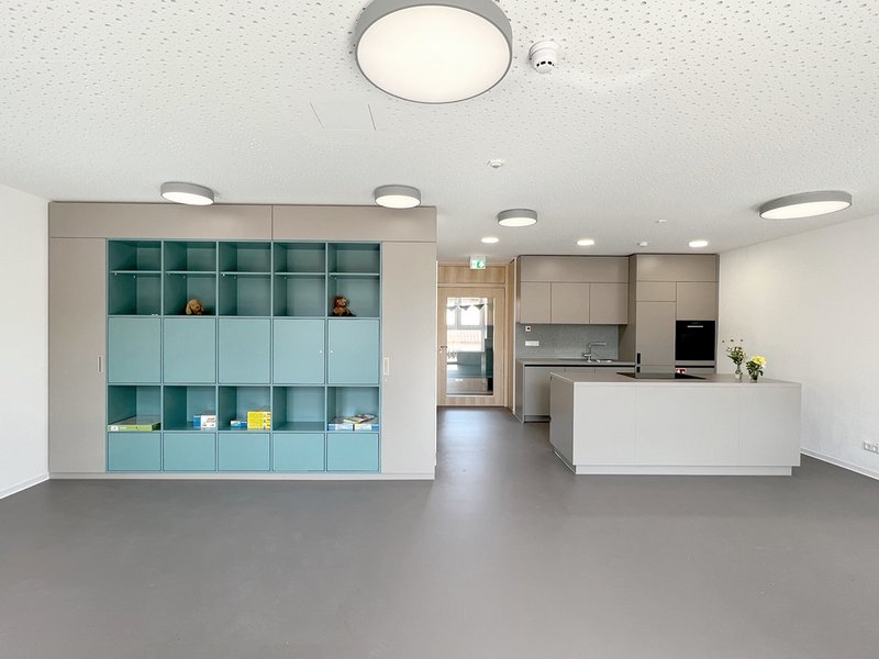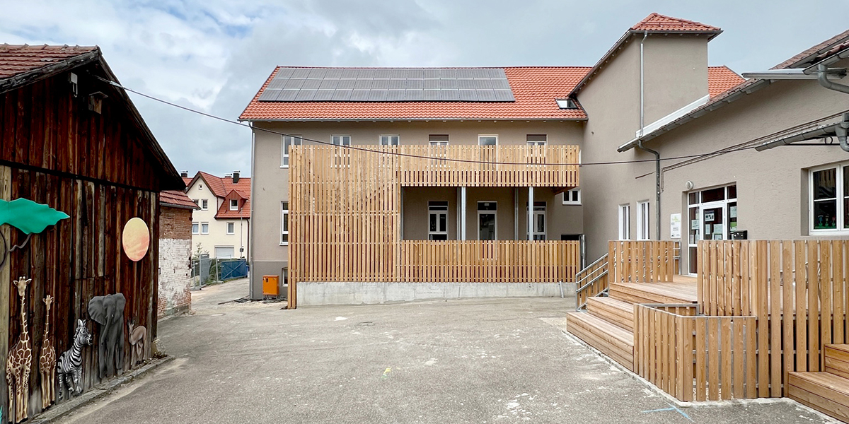 Erschlossen über den neuen barrierefreien Zugang mittels Sichtbetontreppe und Rampe erstreckt sich die Nutzung der Kindertagesstätte über die zwei Geschosse des Bestandsbaus und bindet über das Haupttreppenhaus sowie die nach Süden vorgelagerten Balkone an den gemeinschaftlichen Innenhof an. Das Bestandstreppenhaus mit seiner massiven Treppe aus Eichenholz wurde dabei erhalten, brandschutztechnisch zoniert, baurechtlich ertüchtigt und um einen vorgelagerten Windfang ergänzt.