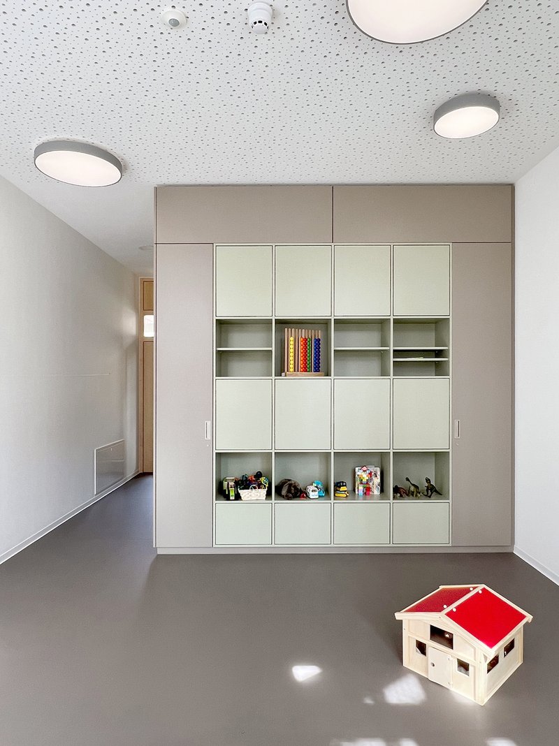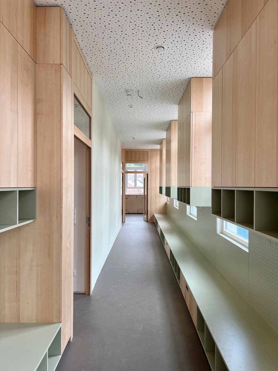 Im Inneren dominieren kindgerechte raumbildende Ausbauten aus hellem Ahornholz, kombiniert mit dezenten Farbtönen des Gebäudes. Die Einbauten ersetzen größtenteils notwendige Trennwände, schaffen Raum für Materialsammlungen und bilden Rückzugsbereiche in Form von Nischen in den Fensterlaibungen für die Kinder.
