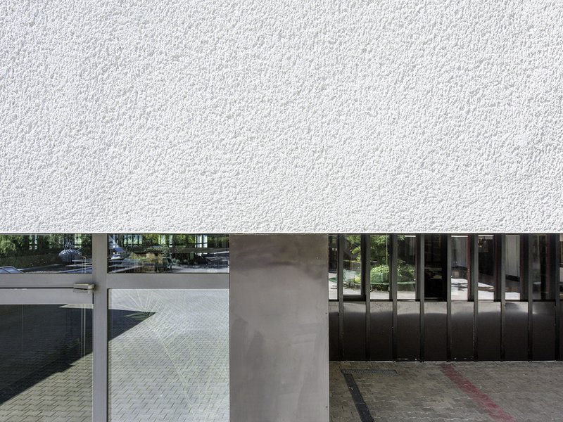 Der in den Hang modellierte kubische Baukörper wird durch eine strenge horizontale Anordnung von Betonbrüstungen und tiefliegenden Holz-Alu-Fensterbändern gegliedert. Um dem heutigen Stand einer energiesparenden Gebäudehülle gerecht zu werden, wurden die Betonfassaden mit ihren kennzeichnenden Brüstungen gedämmt und mit einem homogenen, strukturgebendem Kratzputz mit grober Körnung verputzt. Die zurückliegenden Glasfassaden in den beiden unteren Eingangsgeschossen bieten den Schülern überdeckte Eingangs- und Pausenbereiche. Die raumhohe Verglasung ermöglicht einen fließenden Übergang zwischen Innen und Außen. Die sich daraus ergebende Transparenz wird auch nach der Sanierung aufrechterhalten. So wird die Struktur der durchlaufenden Betonkassettendecken in den überdachten Außenbereichen beibehalten und verleiht dem Schulgebäude weiterhin seinen eigenen Charakter. Statt die auskragenden Decken flächig abzuhängen, werden die einzelnen Träger der Kassette gedämmt und verputzt. Die Deckenfelder werden ebenfalls gedämmt und mit einer Holzverkleidung aus Weißtanne versehen.