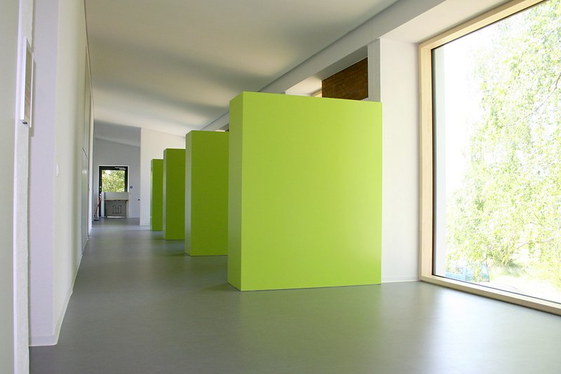 Zur Verbesserung des Brandschutzes im Flur- und Foyerbereich wurden verschiedene Maßnahmen durchgeführt, im wesentlichen aber die Beseitigung der vorhandenen Brandlasten. In diesem Zuge wurde die Flurzone im Obergeschoss neu geordnet und mit neuen Garderoben und Einbauschränken ausgestattet. Schließlich wird die Schule im Außenbereich über eine behindertengerechte Rampe und im Innenbereich durch einen neuen Aufzug barrierefrei erschlossen.