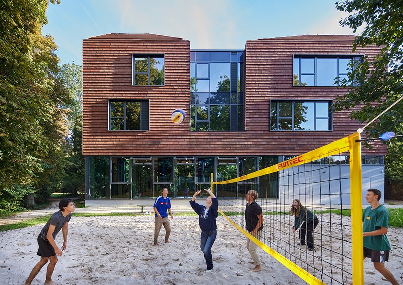Der Neubau bereichert damit die Ansammlung aus unterschiedlichen Schulgebäuden im denkmalgeschützten und atmosphärisch reizvollen ehemaligen Klostergarten. Der dreigeschossige Baukörper in Holz-Hybrid-Bauweise fügt sich durch die Kleinteiligkeit und die heterogen geschuppte Ziegelfassade selbstbewusst in das Bestandsensemble ein. (aus: IBA Heidelberg)