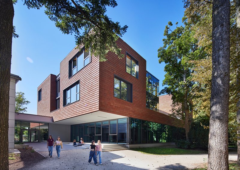 BauweiseHybridbauweise: Untergeschoss und Decken sowie Treppenhaus und je eine Wand der Klassenräume in Sichtbeton.Außenwände und teilweise die Innenwände sowie das Flachdach und die Hauben auf den Häusern als Holzkonstruktion.