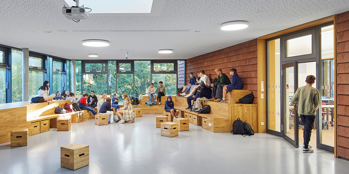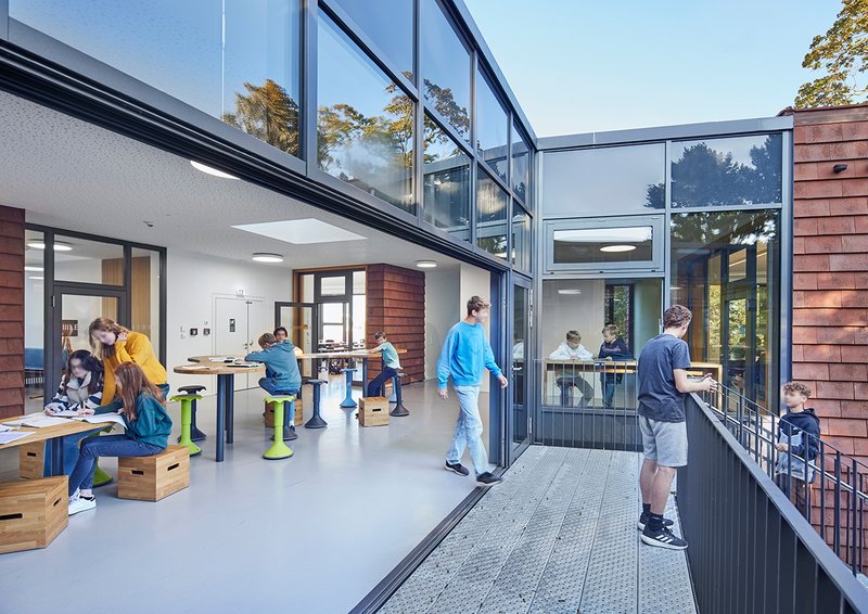 Innovatives Raumprogramm für einen Wandel der pädagogischen PraxisDer Neubau an der Elisabeth-von-Thadden-Schule markiert mit seinem innovativen Raumprogramm den Wandel der pädagogischen Praxis des Gymnasiums, das für die Klassen der Mittelstufe bereits zuvor neue Lernformen erprobte.Der neue Lernort setzt auf vielfältige Raumangebote für „kompetenzorientiertes Lernen“: Die vier Klassenräume entwickeln durch die in die Innenräume gezogenen Ziegelfassaden sogenannte „Heimaten“, die durch einen vorgelagerten, großzügigen "Marktplatz" verbunden werden. Hier haben die Architekt:innen unterschiedliche Zonen für verschiedene Lernmodi gestaltet, wie beispielsweise Bereiche für Teamarbeit und Orte für den Rückzug in das konzentrierte Selbstlernen. Dort schafft das geölte Eichenholz in Fenster- und Türlaibungen sowie auf dem Boden eine Atmosphäre zum Wohlfühlen. Das Farbkonzept unterstützt zudem die Identifikation mit den Räumen.