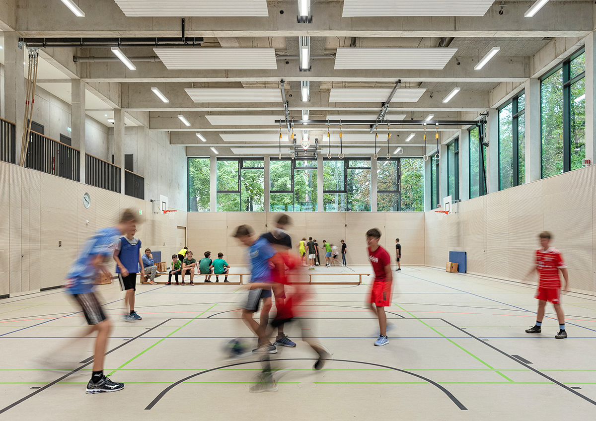 Energiekonzept/ HaustechnikHeizung an den Bestand angeschlossen. Fußbodenheizung in den Obergeschossen, Deckenstrahlplatten in der Sporthalle, Heizkörper in Umkleiden/WCs. Kühlung (nur in den Obergeschossen) über Fußbodenheizung. Keine mechanische Lüftung, Lüftung über die Fenster und Oberlichter in den Hauben in den Obergeschossen. Nachtauskühlung über die Fensterelemente der Fassaden.