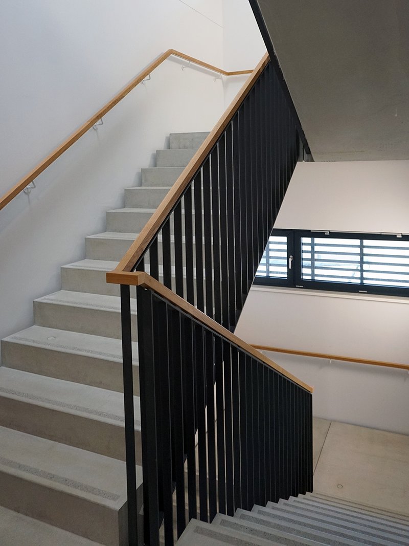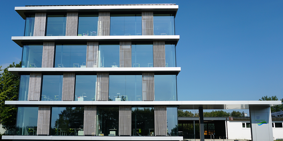 Konzipiert wurde das Gebäude in Holzrahmenbauweise mit vorgefertigten Wand- und Akustikdeckenelementen. Entstanden ist ein viergeschossiger Baukörper mit massivem Untergeschoss mit insgesamt zehn gleichwertigen Klassenräumen, die alle nach Westen mit Blick zur Altstadt ausgerichtet wurden.