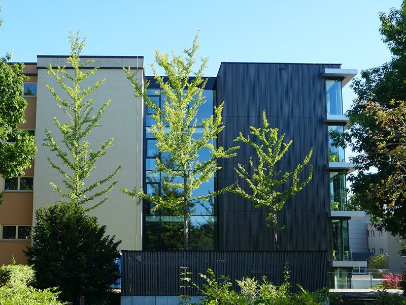 Im zweiten Bauabschnitt wird das Hauptgebäude aus den 70er Jahren mit derselben Fassade des Erweiterungsbaus verkleidet. Somit verschmelzen beide Baukörper zu einem einheitlichen Gebäude.