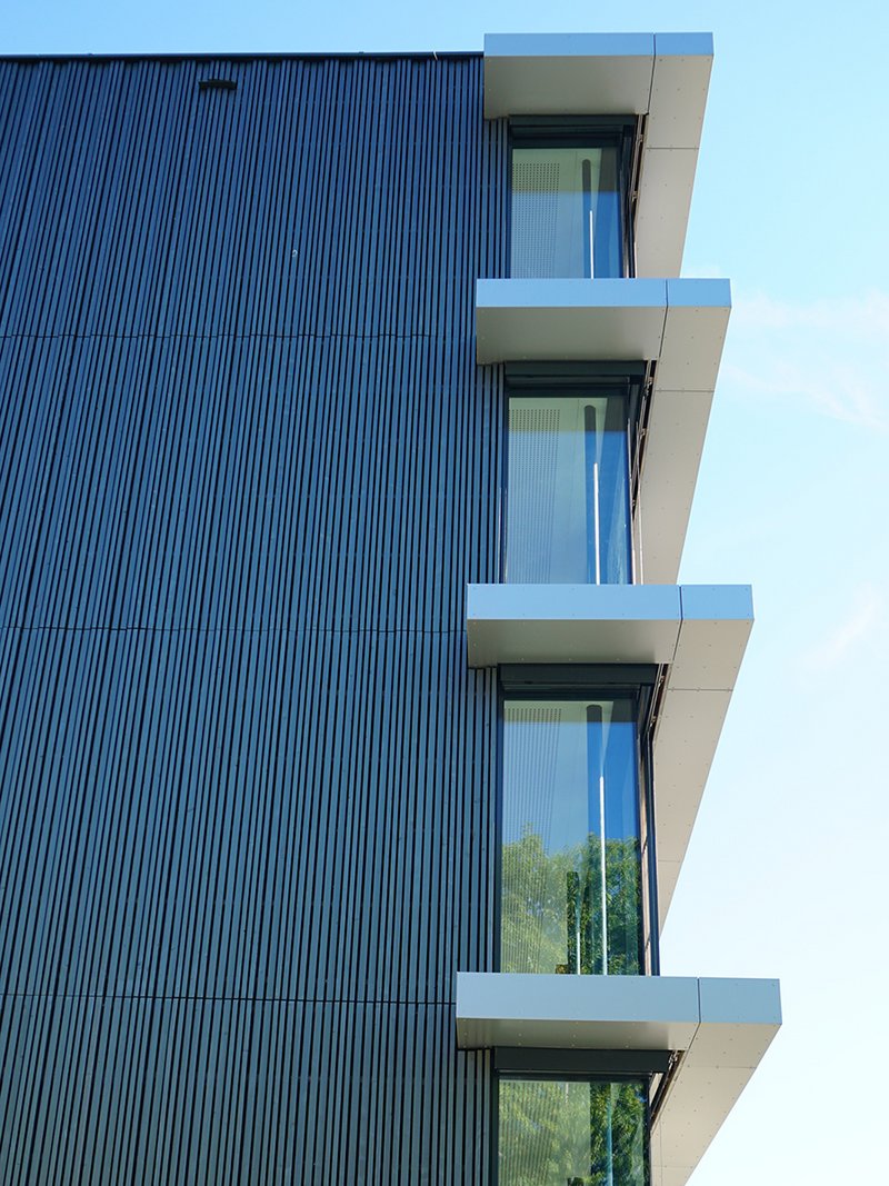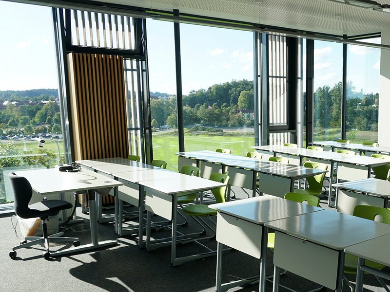 Durch die raumhohen Verglasungen der Klassenzimmer entsteht für die Nutzer &ndash trotz reduzierten Raumgrößen von 68 m² pro Klasse &ndash der Eindruck, sich in einem großzügigen Raum zu befinden. Dieser Eindruck wird nicht zuletzt durch den maximalen Tageslichteintritt erwirkt. Die Schiebeläden aus Holz verleihen der Fensterfassade nicht nur einen hochwertigen Designakzent, sondern verdecken gleichzeitig gekonnt die Lüftungsanlage jedes Klassenzimmers.