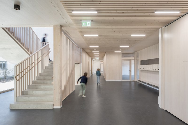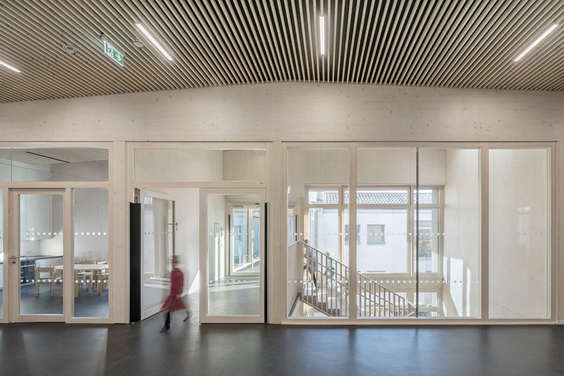 KonstruktionDer Neubau ist als Holzbau mit sichtbaren Brettschichtwänden und -decken über einer Stahlbeton-Gründung konzipiert. Tragende Brettsperrholzwände im Inneren werden durch Brettschichtholz- und Stahlstützen ergänzt. Der Verbindungsbaukörper folgt dem Konstruktionsprinzip des Hauptgebäudes, lediglich die Verglasung wird hier mittels Aufsatzprofilen direkt auf den zimmermannsmäßigen Rohbau rückverankert. Holz prägt, als vertikale Verschalung, auch das äußere Erscheinungsbild.