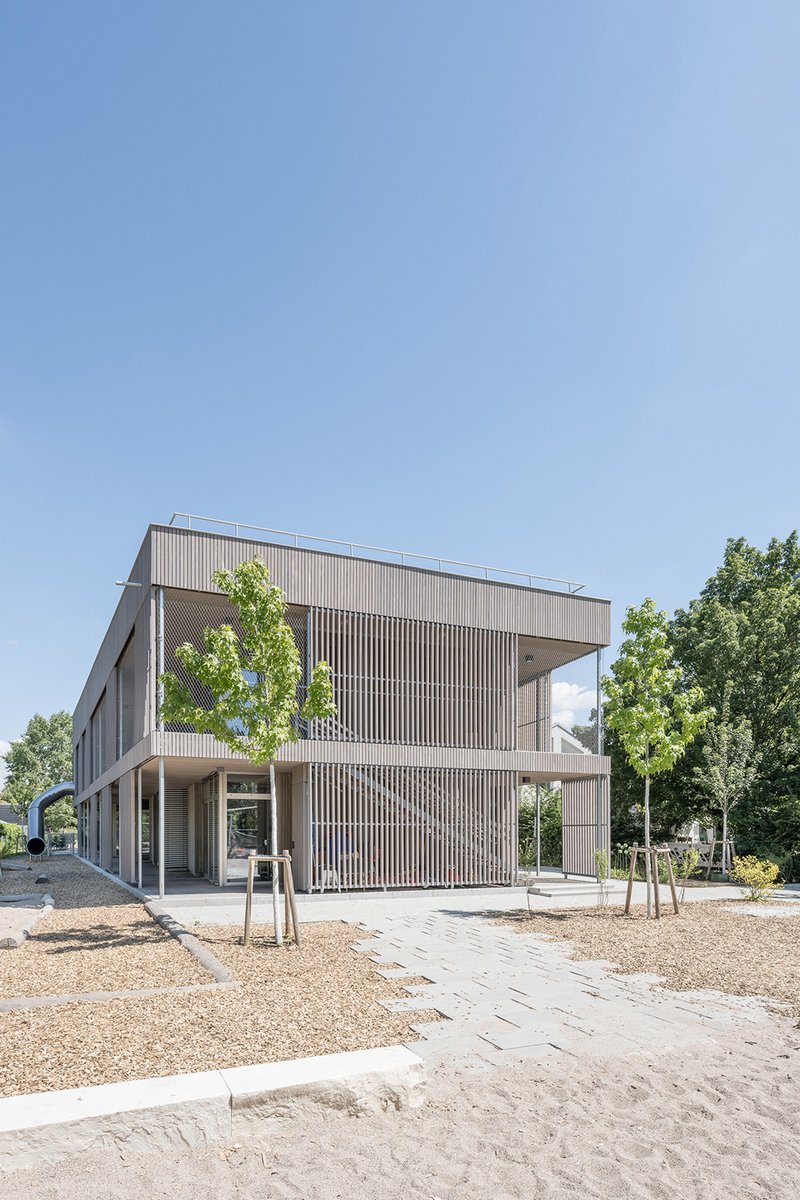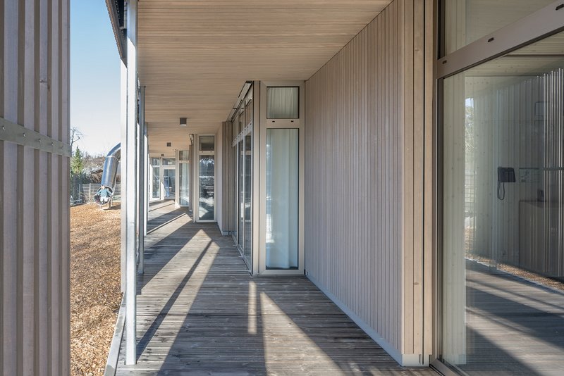 Materialkonzept Das äußere Erscheinungsbild wird von Fensterflächen und vertikaler Holzschalung geprägt. Die teilweise vor den Öffnungsflügeln verlaufende Holzlattung dient als permanenter Sonnenschutz, Einbruchsicherung und Absturzsicherung für die Kinder. Das Konzept des Holzbaus soll auch im Innenraum als haptisches und sensorisches Erleben des natürlichen Baustoffes wahrnehmbar sein, d.h. sämtliche sichtbaren Oberflächen an Wänden und Decken werden in naturbelassenem Tannenholz ausgeführt. Des Weiteren wird an Teilflächen ein zusätzlicher Schallschutz aus dem natürlichen Baustoff angebracht. So werden beispielsweise Holzwolle-Abhangdecken in den Sanitärräumen eingesetzt, akustische Holzpaneele an mehreren Decken angebracht sowie gegebenenfalls Holz-Akustik-Wandbekleidungen verwendet. Die Erschließungsflächen und Aufenthaltsräume sind einheitlich mit Kautschuk belegt, Sanitär- und Küchenbereiche sind im Boden- und belasteten Wandbereich gefliest. Allgemein wird mit den eingesetzten Materialien eine entsprechende, natürliche Farbigkeit realisiert. Farbige Akzente werden in Abstimmung mit dem Nutzer größtenteils auf die Ausstattung reduziert.