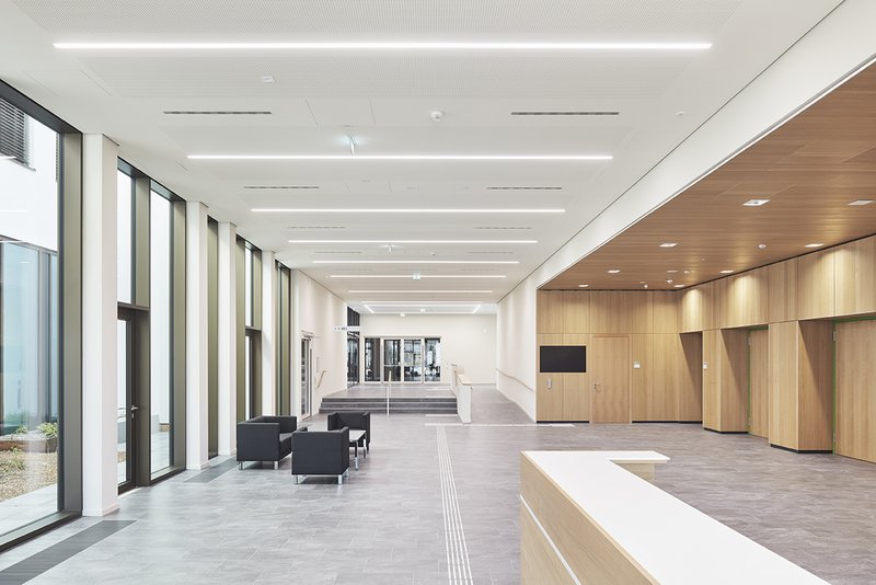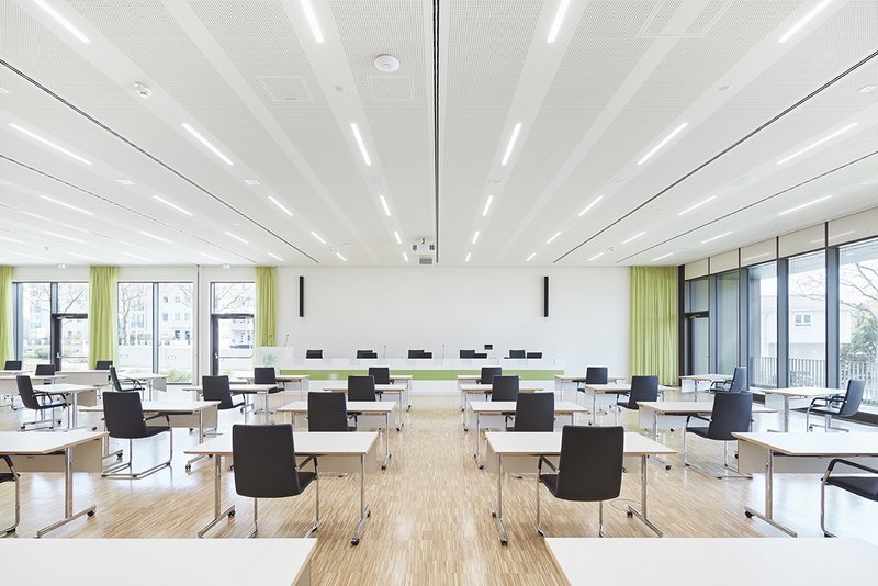 Im Erdgeschoss sind der Sitzungssaal mit 164 Plätzen, die Kantine und das Foyer untergebracht. Alle Bereiche für Veranstaltungen und Sitzungen werden über das zentrale Foyer erschlossen. Dieses ist sowohl von der Lorcher Straße aus als auch aus Richtung des Parkhauses über die Glasfuge zugänglich. So ist eine Abtrennung des Neubaus bei Veranstaltungen möglich, aber dennoch die ideale Anbindung an die bestehenden, in Nord-Süd-Richtung verlaufenden Erschließungsflächen im Hochhaus gegeben.