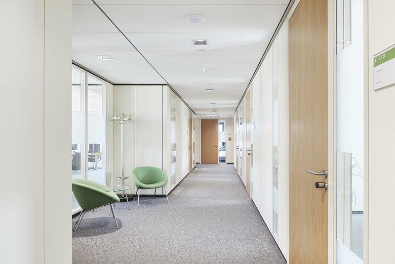 Der Erweiterungsbau umfasst drei Obergeschosse mit je 60 Arbeitsplätzen, die ringförmig um den Innenhof angeordnet sind. Über die Glasfuge wird ein Übergang zum Hochhaus ermöglicht. Das Untergeschoss beherbergt Lagerflächen und die Haustechnik. Das Konzept der Gebäudetechnik beinhaltet nachhaltige Lösungen für Sommer und Winter mit einer Photovoltaikanlage, Regenwasserzisterne, Kältemaschine sowie einem Kaltwasserspeicher und Wärmeerzeuger.
