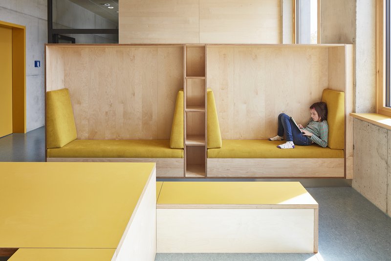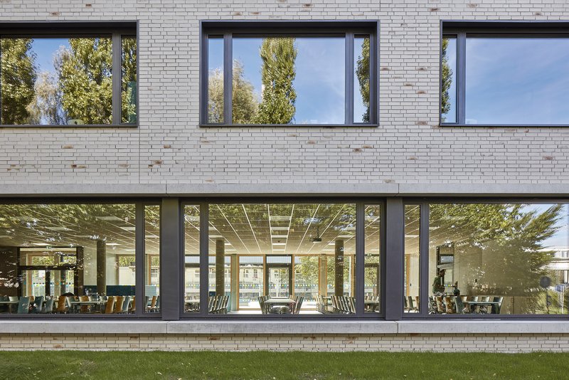 Die Klassenräume in den Obergeschossen sind nach Nordosten zum Grünraum des Mühlenbaches orientiert. Die großzügig aufgeweiteten Flure auf der Südwestseite enthalten neben den Garderoben flexibel nutzbare Arbeits- und Aufenthaltsbereiche. Die Cafeteria im Erdgeschoss ist mit dem Speisesaal nach Süden zum Innenhof orientiert und besitzt einen vorgelagerten, überdachten Außenbereich. Im Dachgeschoss sind Lagerflächen und die Haustechnik untergebracht.
