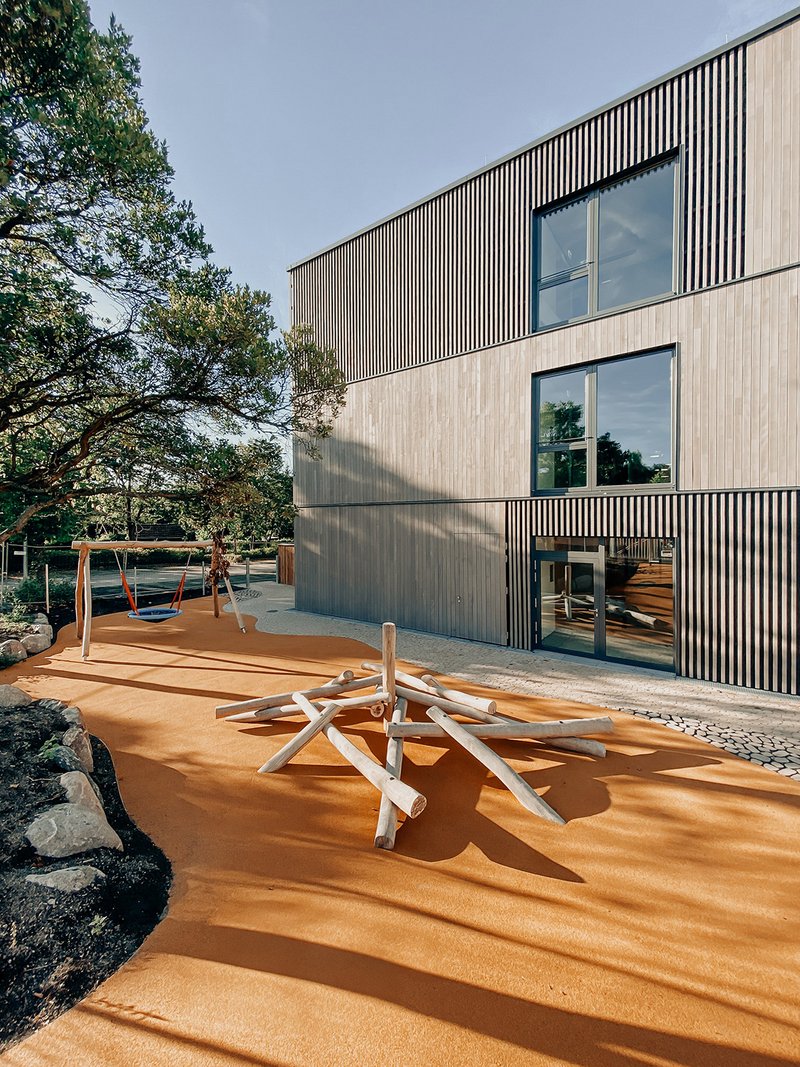 Besonderes Augenmerk wurde auf den sensiblen Umgang mit dem bestehenden Baumbestand gelegt. Durch ein im Vorfeld erstelltes Baumschutzgutachten sowie eine sorgfältige Planung konnte der Neubau mit ausreichendem Abstand zu den geschützten Bäumen platziert werden. Die nördlich und südwestlich angrenzenden Grünstrukturen blieben erhalten und tragen wesentlich zur landschaftlichen Einbindung des Gebäudes bei. Die Erschließung sowie der barrierefreie Zugang des Gebäudes erfolgt über den bestehenden Parkplatz. Die Fröbelstraße dient hierbei als Zufahrtsstraße. Durch den Abriss des alten Containers wurde im Zuge der Planung eine Multifunktionsfläche, die wechselseitig sowohl als Parkplatz als auch aus Schulhof genutzt werden kann, geplant und umgesetzt.
