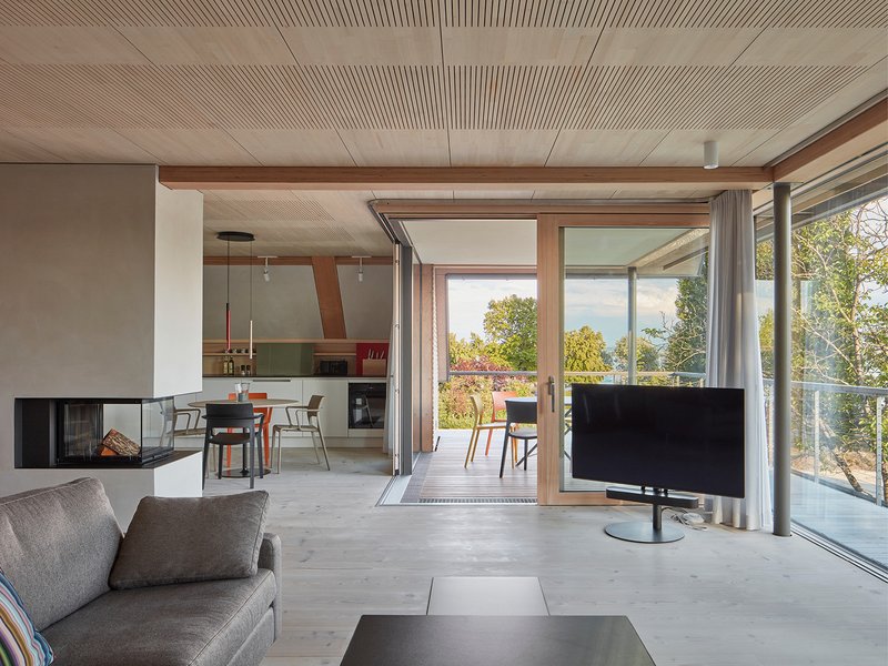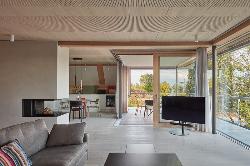 Entwurf und KonstruktionGrundsätzlich waren die Anordnung der Räume und die Hausproportion des alten Hauses auf dem Grundstück gut. So blieben die Erdgeschosswände des Hauses in Massivbauweise stehen. Der Essraum wurde zum See hin erweitert und eine neue Betondecke erstellt. Darauf wurde ein weiteres Geschoss und das Dach in ökologischer und nachhaltiger Holzrahmenbauweise in Verbindung mit einer Binderkonstruktion aus Buche Bauholz errichtet.