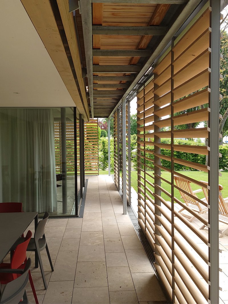 An den kleineren Fenstern wurden als Sicht- und Sonnenschutz übliche Schiebeläden angeordnet, diese fahren hinter die Holzfassade oder die Holzverkleidung wird vor den Nebenräumen, wie Bädern und Ankleide mit Schlitzen weitergeführt. Durch diese Anordnung wird eine harmonische und ruhige Fassade erreicht.