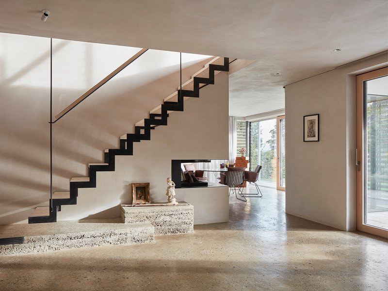 Die Konstruktion des Hauses ist außen ablesbar. Die Putzfassade am Massivbau wird von der Holzverkleidung aus Weißtanne vor der Holzständerbauweise abgelöst. Das Haus ist weitestgehend barrierefrei. Neben der Erschließung der Etagen über das schöne Treppenhaus sind diese auch über einen Aufzug zu erreichen. Das Haus wird mit einer Wasser-Wasser-Wärmepumpe im Winter geheizt und im Sommer gekühlt. Ein Teil der dafür benötigten Energie wird mit der dachintegrierten PV-Anlage erzeugt. Ein Energiespeicher und eine Wallbox ergänzen die energetische Ausnutzung der Anlage.