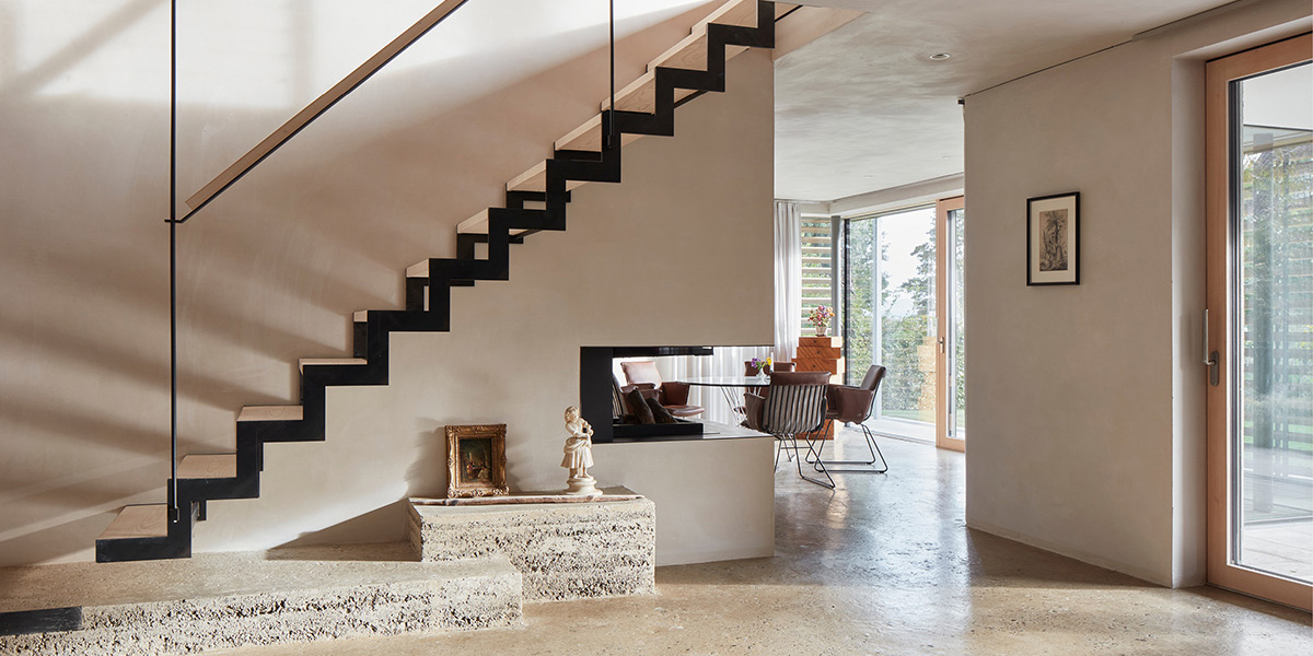 Der Lehmputz wurde im Farbton Kolumba grau aufgetragen und sorgfältigst geglättet. Der Farbton wurde mit dem Schweizer Architekten Peter Zumthor für das Kölner Diözesan Museum Kolumba entwickelt. Dieser leichte Grauton steht in feinem Kontrast zu den warmen Tönen der Fenster und der Böden.