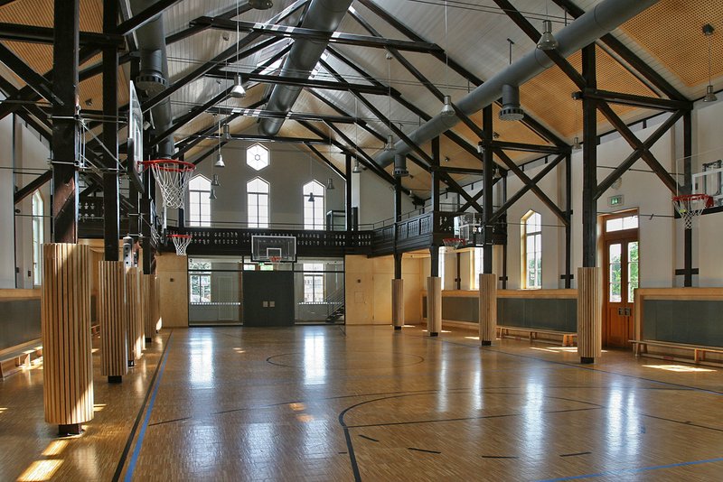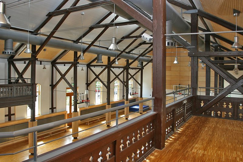 Der Erhalt der ursprünglichen Nutzung ist im Denkmalbereich eher selten. Hier konnte ein Denkmal wieder für den Sportbetrieb genutzt werden. Die aktuellen Anforderungen wurden ablesbar gestaltet. Der Anprallschutz an den Stützen ist leicht reversibel, die Basketballkörbe können mit wenigen Handgriffen demontiert werden. Die Sportnutzung wurde der Qualität der Halle angepasst, auf belastenden Richtungssport wie Fußball oder Handball wird verzichtet.