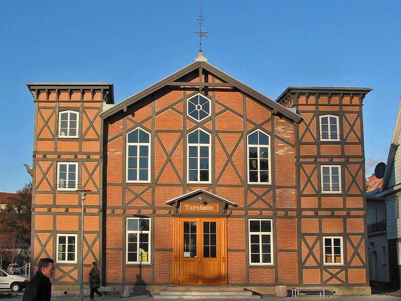 Die Turnhalle aus dem Jahr 1889 wurde in der Architektur der Gründerzeit entsprechend als dreischiffiges Holzfachwerk mit sichtbarer Ziegelausfachung erstellt. Die Türme des Schaugiebels dienten den Steigern der Feuerwehr zur Übung. Der Hallenraum entsprach den damaligen Anforderungen an eine moderne Sportstätte. Die ursprünglich vorhandenen Lohegruben - Sprunggruben mit Rindenmulchfüllung - wurden im Lauf der Zeit geschlossen, Steigeisen an der Holzkonstruktion sind jedoch noch ebenso ursprünglich erhalten wie auch die Halterungen für Ringe und Reck.