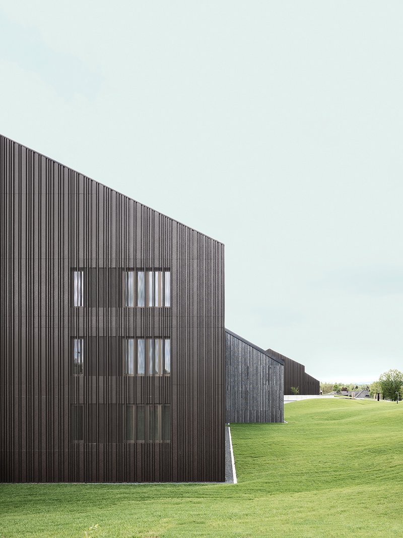 INNOVATIVE FASSADENGESTALTUNG Farben und Materialien nehmen Bezug auf die umgebende Natur. Die transluzent wirkenden, Identität stiftenden Bauten integrieren das gesamte Objekt sensibel in den Landschaftsraum. Die Gebäudehülle zieht sich als Faltenwurf von der Fassade über die Dachflächen hinweg. Die aus Lochblech gestaltete transparente Fassade schafft Ausblicke und sorgt mit zusätzlichem Tageslicht für eine außergewöhnliche Atmosphäre im Innenraum. Nachts strahlt das Licht nach Außen und bringt das Gesamtensemble zum Leuchten.