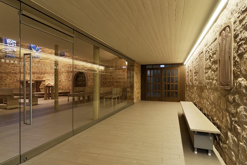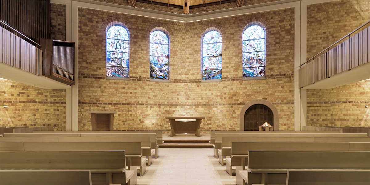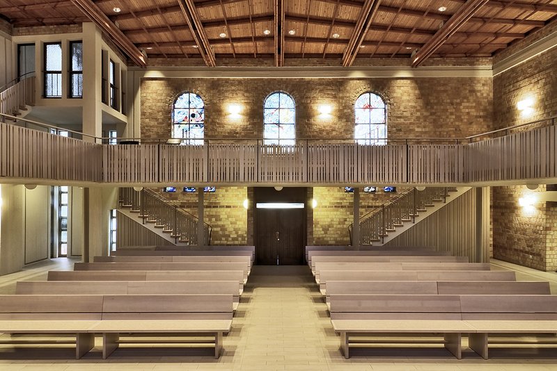 Ausgangspunkt für die Innenrenovierung war die sehr schlechte technische Ausstattung der Kirche. Heizung und Beleuchtung wurden seit dem Wiederaufbau in den Jahren 1959/1960 nicht verändert und waren somit vollständig überholt. Hauptsächliches Anliegen der Kirchengemeinde war die Erneuerung der Heizungsanlage, die Verbesserung der Lichtverhältnisse sowie die Möglichkeit einer flexibleren Nutzung des Raumes. Außerdem bestand der Wunsch, den angebauten Konfirmandensaal zu renovieren.Charakteristisch für den Kircheninnenraum sind nicht nur die Stützen und Deckenflächen aus Sichtbeton, sondern vor allem die Wände aus Ziegelmauerwerk, die in ihrer Farbigkeit von gelb über orange bis rot reichen. Bei der Oberflächengestaltung und der Farbwahl neuer Materialien war somit vorrangiges Ziel, diese architektonischen Besonderheiten hervorzuheben. Als Konsequenz wurden alle neuen Einbauteile in ihrer Farbigkeit zurückgenommen. Die Auswahl der neuen Oberflächen wurde bewusst auf wenige Materialien beschränkt: Feinsteinzeug-Fliesen für die Bodenbeläge, Holz für Geländer, Schrankeinbauten und neue Bestuhlung. Die neuen Holzgeländer sowie Schrankeinbauten wurden passend zum Betongrau des neuen Feinsteinzeug-Fliesenbelags grau lasiert. In den neuen Kirchenbänken und Kirchenstühlen finden sich die gleichen Farbnuancen. Der Anbau einer neuen Sakristei ermöglichte die Erweiterung des Konfirmandensaals in Richtung Hof. Es entstand ein heller, freundlicher Raum mit großzügiger Verglasung zum neu gestalteten Innenhof.