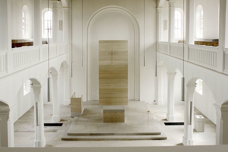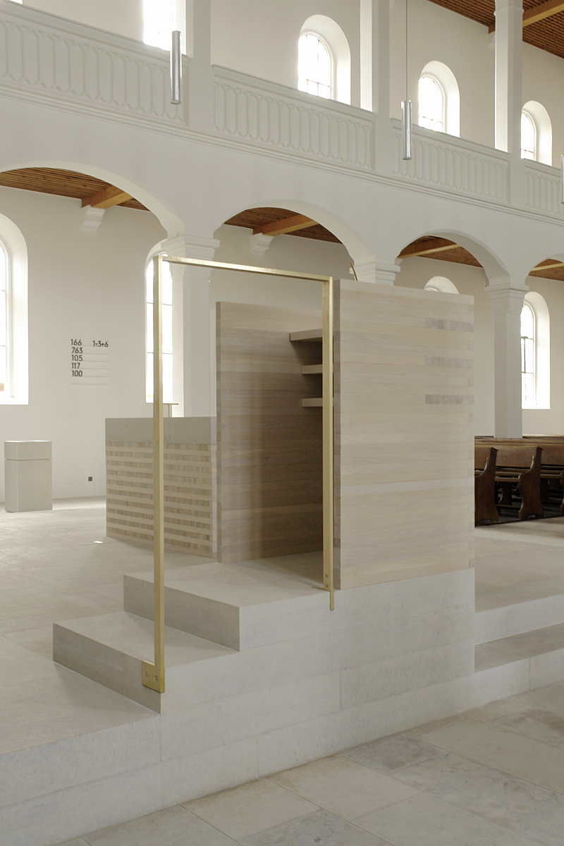 UmsetzungUm die Altarwand zu beruhigen, wurde das runde Fenster aus den 1960er Jahren wieder geschlossen. Der Bereich hinter dem Altar erhielt eine Wandscheibe, die den Sakristeieingang abdeckt und den Rückbereich fasst. Da die historischen Wandbekleidungen fehlen, wurden nach einem neuen Farb-Konzept alle Innenwandflächen weiß gestrichen. Pfeiler und Stützen mit ihren plastischen Details sind besser sichtbar und das Tageslicht mit seiner wechselnden Farbigkeit ist im Kirchenraum erlebbar. Der Altarbereich wurde von den Seiten gelöst und freier in den Raum gestellt. Er ist aus massiven Kalksteinplatten und -blöcken hergestellt, die ein steinernes Bodenrelief bilden. Der Altar besteht aus geschichteten Eichenstäben, die eine Kalksteinplatte tragen. Die Prinzipalstücke sind ebenfalls aus massivem, gekalktem Eichenholz geschichtet und gefügt. Der Taufort besteht aus Kalkstein. Der Aufbau und die Fügung der neuen Ergänzungen sind einfach und unmittelbar nachvollziehbar. Der Raum ist mit Materialien ergänzt, die ursprünglich verwendet wurden: Stein, Holz und Messing.