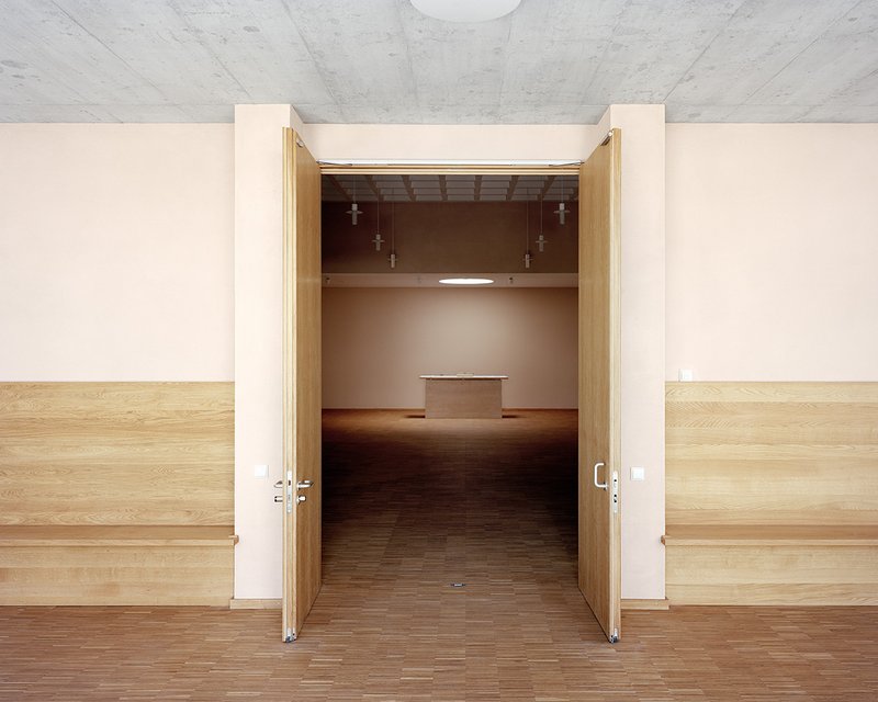 Die innere Organisation basiert auf einem kreuzförmigen Grundriss. Der strukturell bestehende Sakralraum erhält eine seiner Wichtigkeit angemessene Lage in der Mitte des Gebäudes und wird gänzlich neugestaltet. Er wird dreiseitig flankiert von Foyer, Gemeindesaal und Gruppenraum. In den vier Raumecken des Gebäudes befinden sich die kleineren Nebenräume an einem umlaufenden Gang. Die Erschließung wird zum verbindenden Element innerhalb des Gemeindezentrums.