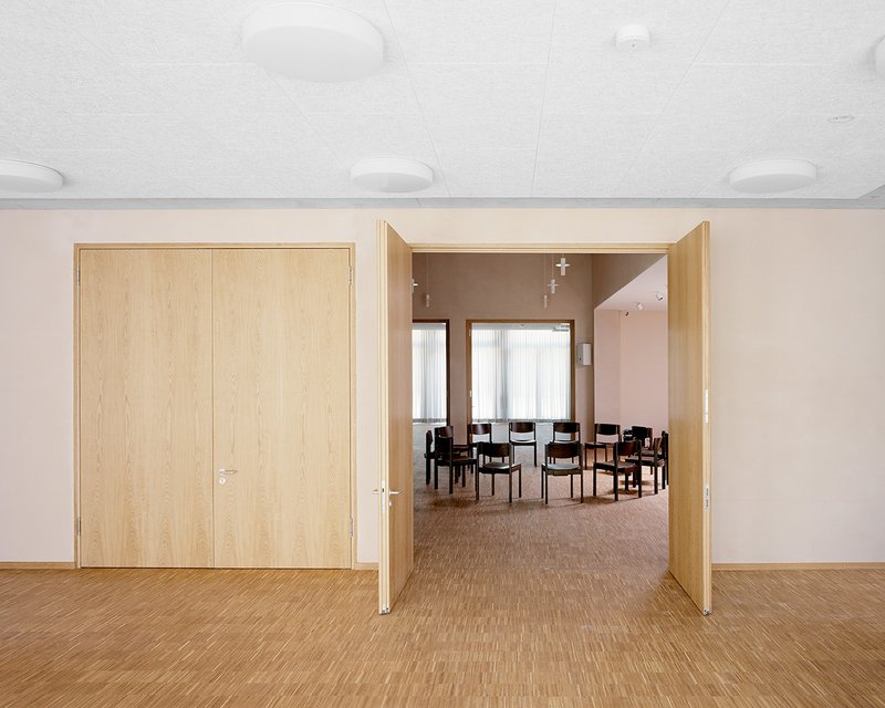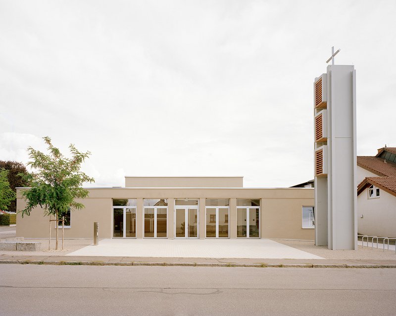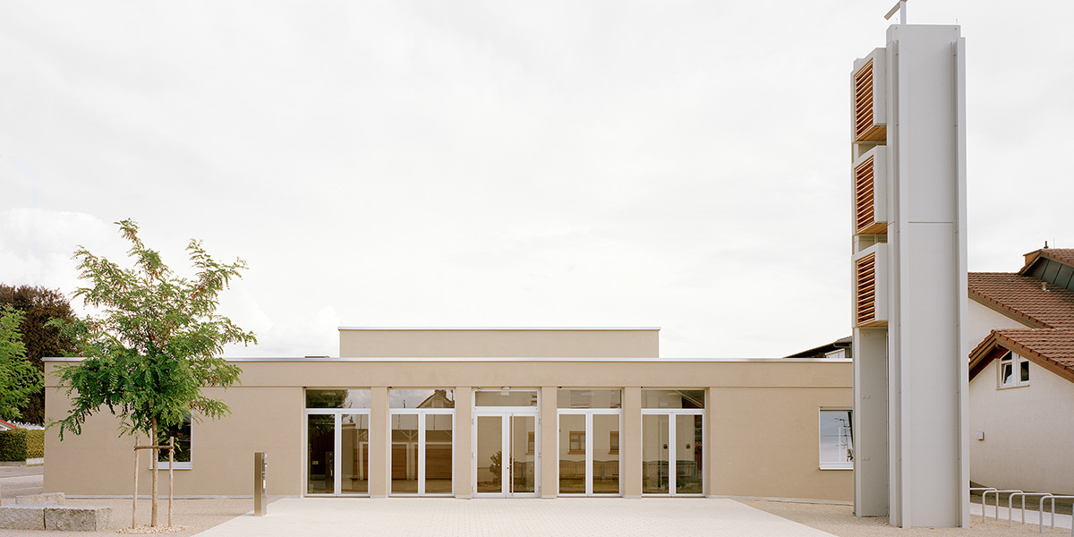 Das in die Jahre gekommene evangelische Gemeindezentrum kam innerhalb des Einfamilienhausquartiers bisher wenig zur Geltung: Es war in seiner Erscheinung kaum von den umliegenden Wohnhäusern zu unterscheiden. Bis auf den Sakralraum wurden die bestehenden, nicht barrierefreien Gebäudeteile rückgebaut und um neue, schwellenlos zu erreichende Räume ergänzt. Der neu entstandene Gebäudekörper ist denkbar einfach: ein flaches, rechteckiges Volumen mit erhöhter Mitte korrespondiert mit dem sich hoch aufrichtenden bestehenden Glockenturm. Dank dem Vorplatz mit Glockenturm und breitem Eingangsbereich erhält das neue Gemeindezentrum die ihm gebührende Adresse innerhalb des Quartiers.