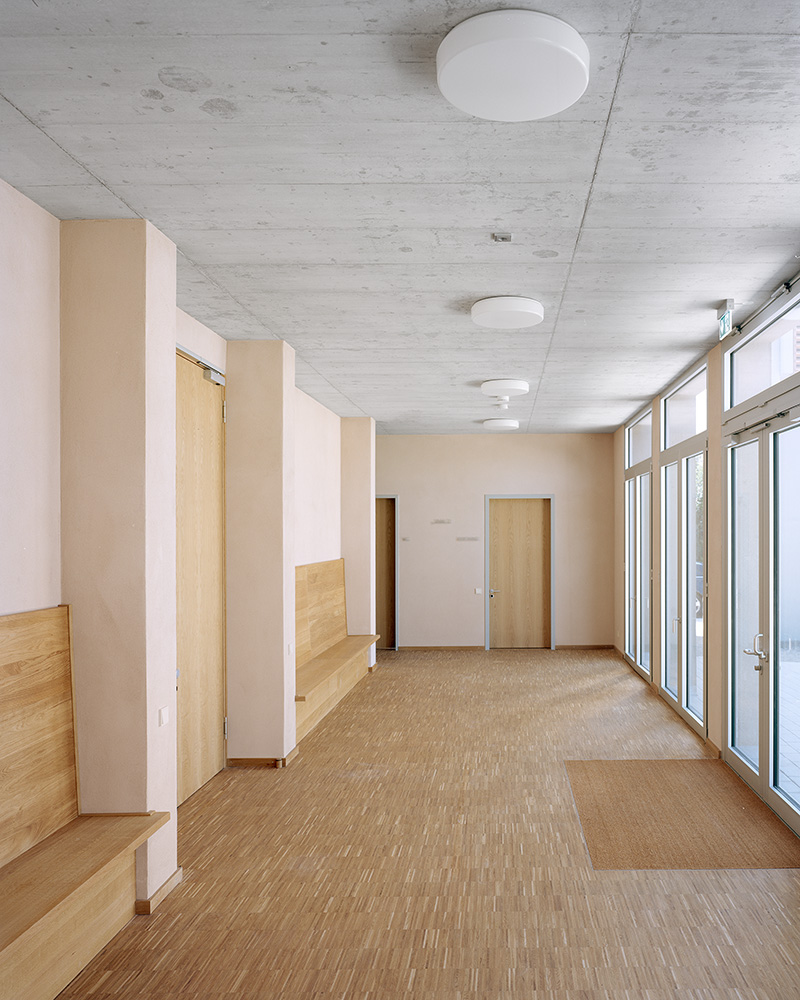 Die neuen tragenden Wände werden mit einem feinen ungestrichenen Kalkputz versehen. Alle Holzeinbauten bleiben roh und werden zum Schutz der Oberfläche geölt. Die großen Räume erhalten raumhohe strukturelle Öffnungen, um eine gute Belichtung in die Tiefe des Raumes zu ermöglichen. Die kleinen Räume erhalten Lochfenster, welche die Massivität der Gebäudeecken unterstreichen.