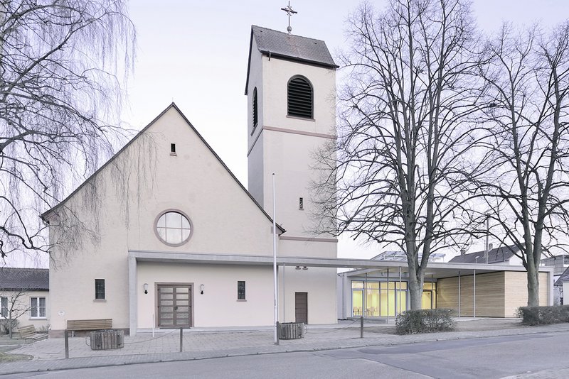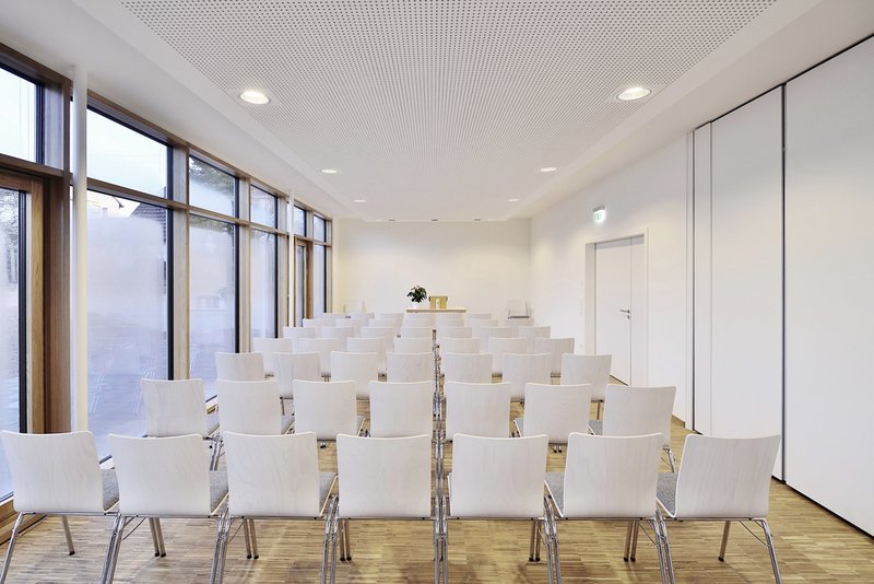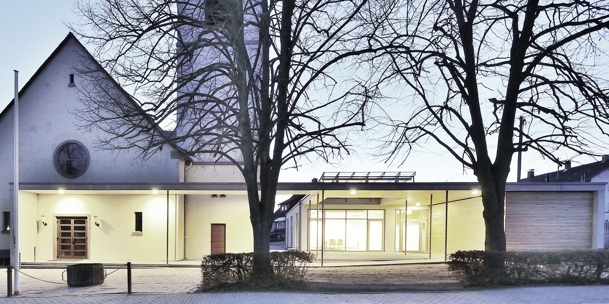Das in den 1950er Jahren gebaute Ensemble aus Kirche, Pfarrhaus und dembestehenden Gemeindesaal bleibt durch die Erweiterung weitgehend unberührt. Das neue Gemeindehaus wurde als eigenständiger Baukörper auf der entgegengesetzten Seite der Kirche errichtet und stärkt damit die Präsenz der evangelischen Kirchengemeinde im Stadtbild. Der eingeschossige Baukörper wurde an der nördlichen Grundstücksgrenze platziert und springt mit seinem Hauptvolumen zurück. Die auf die Mittelachse der Kirche führende Straße setzt diese damit in den Mittelpunkt des erweiterten Gesamtensembles.Hinter den funktionalen Gedanken zur Anordnung der geforderten Räumlichkeiten steht die Idee, das Gemeindehaus wie mit einer Klammer an das bestehende Gemeindezentrum anzubinden. Die Kirche erhielt dadurch endlich das fehlende Eingangsportal. Vor dem Hauptzugang erweitern sich die Räumlichkeiten in einen einladenden, großen überdachten Freibereich, der vielen Menschen darunter einen geschützten Aufenthalt ermöglicht und diesen mit Leben füllt. Bei schönem Wetter findet das Gemeindeleben im Freien statt. Das Haus versucht neutral zu sein und einen Rahmen zu schaffen für die darin stattfindenden Aktivitäten. Ein Haus, das sowohl innen mit seinen drei Sälen als auch außen mit seinen vielen Freibereichen multifunktional ist und Innen und Außen miteinander verzahnt. Die Gruppenräume umschließen das zur Schachleiterstraße orientierte kleine Foyer, das ein wichtiger Bestandteil der Gesamtkonzeption ist. Die Lage der Küche ermöglicht sowohl eine Andienung aller Räume wie auch der Freibereiche.